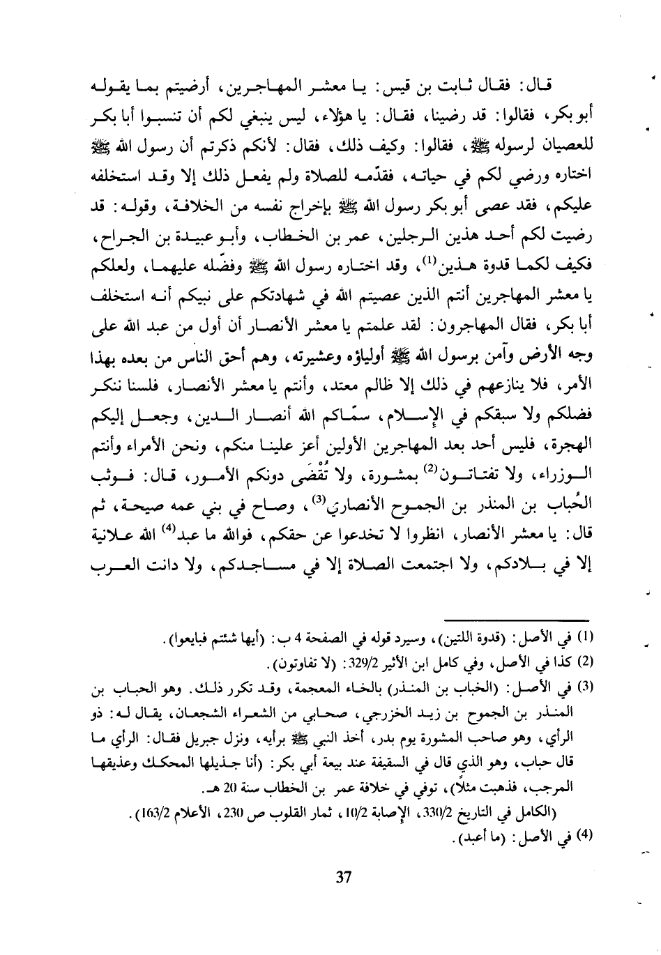قَالَ: فَقَالَ ثَابِتُ بْنُ قَيْسٍ: يَا مَعْشَرَ الْمُهَاجِرِينَ، أَرَضِيتُمْ بِمَا يَقُولُهُ أَبُو بَكْرٍ، فَقَالُوا: قَدْ رَضِينَا، فَقَالَ: يَا هَؤُلاءِ، لَيْسَ يَنْبَغِي لَكُمْ أَنْ تَنْسُبُوا أَبَا بَكْرٍ لِلْعِصْيَانِ لِرَسُولِهِ صلّى الله عليه وآله وَسَلَّمَ، فَقَالُوا: وَكَيْفَ ذَلِكَ، فَقَالَ: لأَنَّكُمْ ذَكَرْتُمْ أن رسول الله صلّى الله عليه وآله وَسَلَّمَ اخْتَارَهُ وَرَضِيَ لَكُمْ فِي حَيَاتِهِ، فَقَدَّمَهُ لِلصَّلاةِ وَلَمْ يَفْعَلْ ذَلِكَ إِلا وَقَدِ اسْتَخْلَفَهُ عَلَيْكُمْ، فَقَدْ عَصَى أَبُو بَكْرٍ رَسُولَ اللَّهِ صلّى الله عليه وآله وَسَلَّمَ بِإِخْرَاجِ نَفْسِهِ مِنَ الْخِلافَةِ، وَقَوْلُهُ: قَدْ رَضِيتُ لَكُمْ أَحَدَ هَذَيْنِ الرَّجُلَيْنِ، عُمَرُ بْنُ الْخَطَّابِ، وَأَبُو عُبَيْدَةَ بْنُ الْجَرَّاحِ، فَكَيْفَ لَكُمَا قُدْوَةُ هَذَيْنِ [1] ، وَقَدِ اخْتَارَهُ رَسُولُ اللَّهِ صَلَّى الله عليه وآله وَسَلَّمَ وَفَضَّلَهُ عَلَيْهِمَا، وَلَعَلَّكُمْ يَا مَعْشَرَ الْمُهَاجِرِينَ أَنْتُمُ الَّذِينَ عَصَيْتُمُ اللَّهَ فِي شَهَادَتِكُمْ عَلَى نَبِيِّكُمْ أَنَّهُ اسْتَخْلَفَ أَبَا بَكْرٍ، فَقَالَ الْمُهَاجِرُونَ: لَقَدْ عَلِمْتُمْ يَا مَعْشَرَ الأَنْصَارِ أَنَّ أَوَّلَ مَنْ عَبَدَ اللَّهَ عَلَى وَجْهِ الأَرْضِ وَآمَنَ برسول الله صلّى الله عليه وآله وَسَلَّمَ أَوْلِيَاؤُهُ وَعَشِيرَتُهُ، وَهُمْ أَحَقُّ النَّاسِ مِنْ بَعْدِهِ بِهَذَا الأَمْرِ، فلا يُنَازِعُهُمْ فِي ذَلِكَ إِلا ظَالِمٌ مُعْتَدٍ، وَأَنْتُمْ يَا مَعْشَرَ الأَنْصَارِ، فَلَسْنَا نُنْكِرُ فَضْلَكُمْ وَلا سَبْقَكُمْ فِي الإِسْلامِ، سَمَّاكُمُ اللَّهُ أَنْصَارَ الدِّينِ، وَجَعَلَ إِلَيْكُمُ الْهِجْرَةَ، فَلَيْسَ أَحَدٌ بَعْدَ الْمُهَاجِرِينَ الأَوَّلِينَ أَعَزَّ عَلَيْنَا منكم، ونحن الأمراء وأنتم الوزراء، ولا تفتاتون [2] بِمَشُورَةٍ، وَلا تُقْضَى دُونَكُمُ الأُمُورُ، قَالَ: فَوَثَبَ الحباب بن المنذر بن الجموح الأنصاري [3] ، وصاحب فِي بَنِي عَمِّهِ صَيْحَةً، ثُمَّ قَالَ: يَا مَعْشَرَ الأَنْصَارِ، انْظُرُوا لا تُخْدَعُوا عَنْ حَقِّكُمْ، فو الله مَا عُبِدَ [4] اللَّهُ عَلانِيَةً إِلا فِي بِلادِكُمْ، وَلا اجْتَمَعَتِ الصَّلاةُ إِلا فِي مَسَاجِدِكُمْ، وَلا دانت العرب