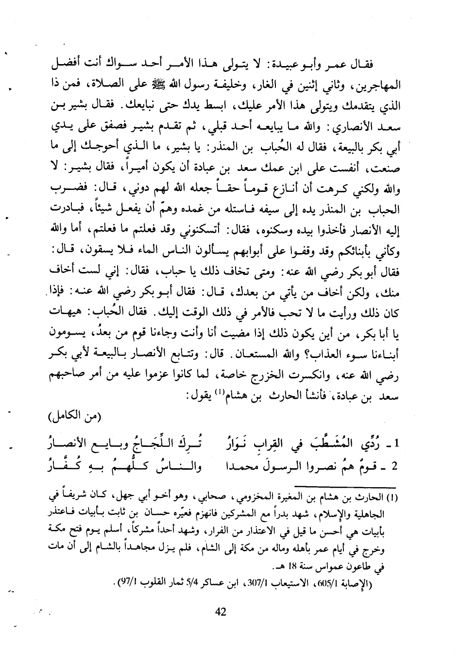 فَقَالَ أَبُو بَكْرٍ رَضِيَ اللَّهُ عَنْهُ: وَمَتَى تَخَافُ ذَلِكَ يَا حُبَابُ، فَقَالَ: إِنِّي لَسْتُ أَخَافُ مِنْكَ، وَلَكِنْ أَخَافُ مَنْ يَأْتِي مِنْ بَعْدِكَ، قَالَ: فَقَالَ أَبُو بَكْرٍ رَضِيَ اللَّهُ عَنْهُ: فَإِذَا كَانَ ذَلِكَ وَرَأَيْتَ مَا لا تُحِبُّ فَالأَمْرُ فِي ذَلِكَ الْوَقْتِ إِلَيْكَ. فَقَالَ الحباب: هيهات يا أبابكر، مِنْ أَيْنَ يَكُونُ ذَلِكَ إِذَا مَضَيْتُ أَنَا وَأَنْتَ وَجَاءَنَا قَوْمٌ مِنْ بَعْدُ، يَسُومُونَ أَبْنَاءَنَا سُوءَ الْعَذَابِ؟ وَاللَّهُ الْمُسْتَعَانُ. قَالَ: وَتَتَابَعَ الأَنْصَارُ بِالْبَيْعَةِ لأَبِي بَكْرٍ رَضِيَ اللَّهُ عَنْهُ، وَانْكَسَرَتِ الْخَزْرَجُ خَاصَّةً، لِمَا كَانُوا عَزَمُوا عَلَيْهِ مِنْ أَمْرِ صَاحِبِهِمْ سَعْدِ بْنِ عُبَادَةَ، فَأَنْشَأَ الْحَارِثُ بْنُ هِشَامٍ [1] يَقُولُ: