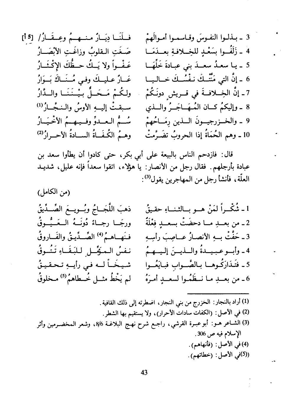 7- إِنَّ الْخِلافَةَ فِي قُرَيْشٍ دُونَكُمْ ... وَلَكُمْ مَحِلٌّ بَيْنِنَا وَالدَّارُ