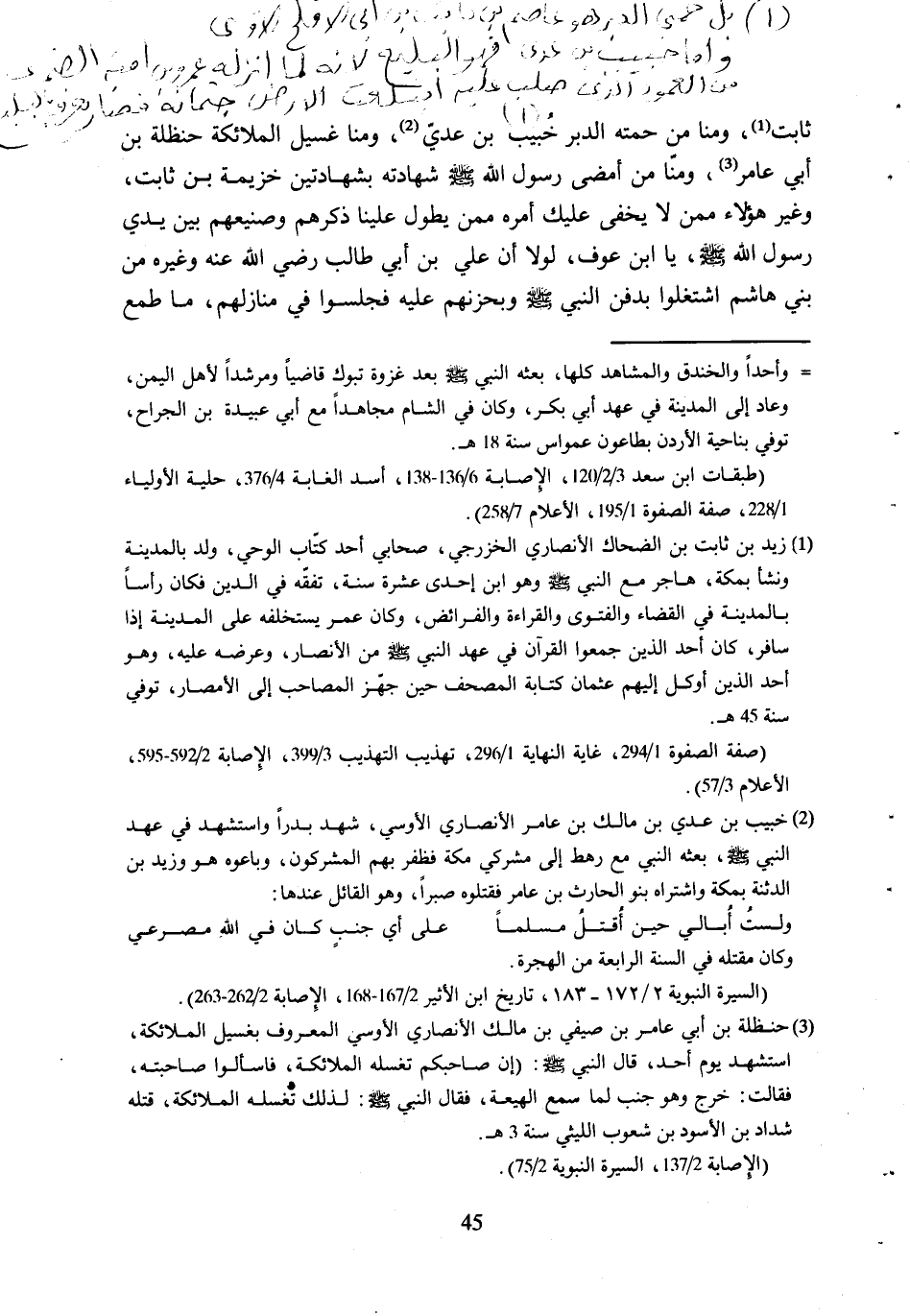 [3] حنظلة بن أبي عامر بن صيفي بن مالك الأنصاري الأوسي المعروف بغسيل الملائكة، استشهد يوم أحد، قال النبي صلّى الله عليه وآله وسلّم: (إن صاحبكم تغسله الملائكة، فاسألوا صاحبته، فقالت: خرج وهو جنب لما سمع الهيعة، فقال النبي صلّى الله عليه وآله وسلّم: لذلك تغسله الملائكة، قتله شداد بن الأسود بن شعوب الليثي سنة 3 هـ-.