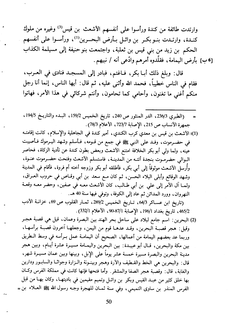 وَارْتَدَّتْ طَائِفَةٌ مِنْ كِنْدَةَ وَرَأَّسُوا عَلَى أَنْفُسِهِمُ الأَشْعَثَ بْنَ قَيْسٍ [1] وَغَيْرَهُ مِنْ مُلُوكِ كِنْدَةَ، وَارْتَدَّتْ بَنُو بَكْرِ بْنِ وَائِلٍ بِأَرْضِ الْبَحْرَيْنِ [2] ، وَرَأَّسُوا عَلَى أَنْفُسِهِمُ الْحَكَمَ بْنَ زَيْدٍ مِنْ بَنِي قَيْسِ بْنِ ثَعْلَبَةَ، وَاجْتَمَعَتْ بَنُو حَنِيفَةَ إلى مسيلمة الكذاب [6 ب] بِأَرْضِ الْيَمَامَةِ، فَقَلَّدُوهُ أَمْرَهُمْ وَادَّعَى أَنَّهُ/ نَبِيُّهُمْ.