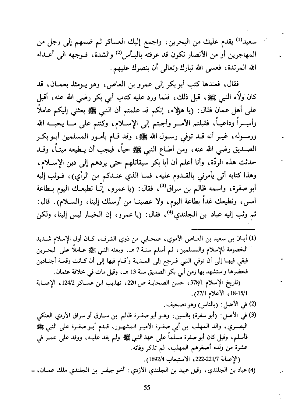 فَقَالَ، فَعِنْدَهَا كَتَبَ أَبُو بَكْرٍ إِلَى عَمْرِو بْنِ الْعَاصِ، وَهُوَ يَوْمَئِذٍ بِعُمَانَ، قَدْ كَانَ ولّاه النبي صلّى الله عليه وآله وَسَلَّمَ، قَبْلَ ذَلِكَ، فَلَمَّا وَرَدَ عَلَيْهِ كِتَابُ أَبِي بَكْرٍ رَضِيَ اللَّهُ عَنْهُ، أَقْبَلَ عَلَى أَهْلِ عُمَانَ فَقَالَ: (يَا هَؤُلاءِ، إِنَّكُمْ قَدْ علمتم أن النبي صلّى الله عليه وآله وَسَلَّمَ بَعَثَنِي إِلَيْكُمْ عَامِلا وَأَمِيرًا وَدَاعِيًا، فَقَبِلْتُمُ الأَمْرَ وَأَجَبْتُمْ إِلَى الإِسْلامِ، وَكُنْتُمْ عَلَى مَا يُحِبُّهُ اللَّهُ وَرَسُولُهُ، غَيْرَ أَنَّهُ قَدْ تُوُفِّيَ رسول الله صلّى الله عليه وآله وَسَلَّمَ، وَقَدْ قَامَ بِأُمُورِ الْمُسْلِمِينَ أَبُو بَكْرٍ الصِّدِّيقُ رَضِيَ اللَّهُ عَنْهُ، وَمَنْ أَطَاعَ النَّبِيَّ صلّى الله عليه وآله وَسَلَّمَ حَيًّا، فَيَجِبُ أَنْ يُطِيعَهُ مَيِّتًا، وَقَدْ حَدَثَتْ هَذِهِ الرِّدَّةُ، وَأَنَا أَعْلَمُ أَنَّ أَبَا بَكْرٍ سَيُقَاتِلُهُمْ حَتَّى يَرُدَّهُمْ إِلَى دِينِ الإِسْلامِ، وَهَذَا كِتَابُهُ أَتَى يَأْمُرُنِي بِالْقُدُومِ عَلَيْهِ، فَمَا الَّذِي عِنْدَكُمْ مِنَ الرَّأْيِ) ، فَوَثَبَ إِلَيْهِ أَبُو صُفْرَةَ، وَاسْمُهُ ظَالِمُ بْنُ سَرَّاقٍ [3] ، فَقَالَ: (يَا عَمْرُو، إِنَّا نُطِيعُكَ الْيَوْمَ بِطَاعَةِ أَمْسِ، وَنُطِيعُكَ غَدًا بِطَاعَةِ الْيَوْمَ، وَلا عَصَيْنَا مَنْ أَرْسَلَكَ إِلَيْنَا، وَالسَّلامُ) . قَالَ: