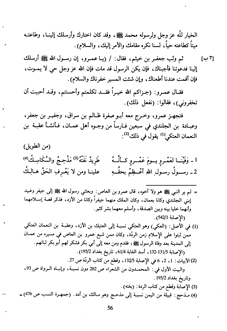 [7 ب] ثُمَّ وَثَبَ جَعْفَرُ بْنُ خَيْثَمٍ، فَقَالَ: / (يَا عَمْرُو، إِنَّ رَسُولَ اللَّهِ صَلَّى اللَّهُ عَلَيْهِ وآله وَسَلَّمَ أَرْسَلَكَ إِلَيْنَا فَدَعَوْتَنَا فَأَجَبْنَاكَ، فَإِنْ يَكُنِ الرَّسُولُ قَدْ مَاتَ فَإِنَّ اللَّهَ عَزَّ وَجَلَّ حَيٌّ لا يَمُوتُ، فَإِنْ أَقَمْتَ عِنْدَنَا أَطَعْنَاكَ، وَإِنْ شِئْتَ الْمَسِيرَ خَفَرْنَاكَ وَالسَّلامُ) .