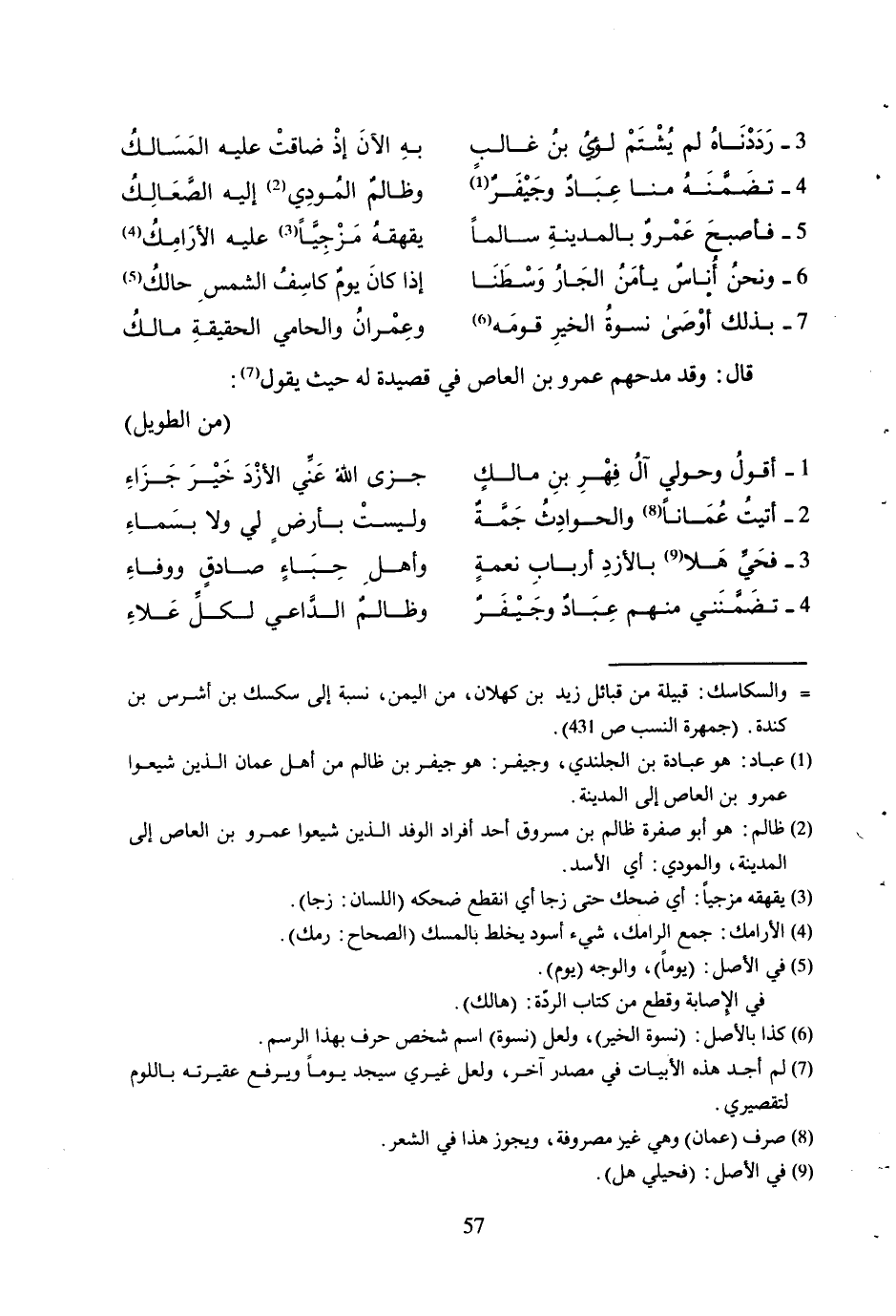 قَالَ: وَقَدْ مَدَحَهُمْ عَمْرُو بْنُ الْعَاصِ فِي قَصِيدَةٍ لَهُ حَيْثُ يَقُولُ [7] :