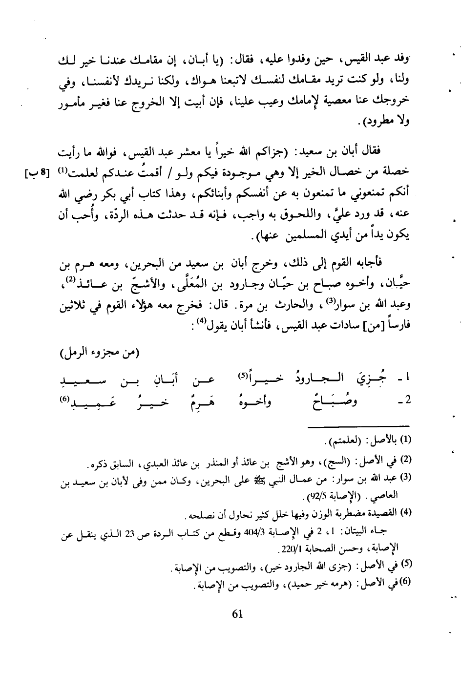 فَقَالَ أَبَانُ بْنُ سَعِيدٍ: (جَزَاكُمُ اللَّهُ خَيْرًا يَا معشر عبد القيس، فو الله مَا رَأَيْتُ خَصْلَةً مِنْ خِصَالِ الْخَيْرِ إِلا وَهِيَ مَوْجُودَةٌ فِيكُمْ وَلَوْ/ أَقَمْتُ عِنْدَكُمْ لَعَلِمْتُ [1] [8 ب] أَنَّكُمْ تَمْنَعُونِي مَا تَمْنَعُونَ بِهِ عَنْ أَنْفُسِكُمْ وَأَبْنَائِكُمْ، وَهَذَا كِتَابُ أَبِي بَكْرٍ رَضِيَ اللَّهُ عَنْهُ، قَدْ وَرَدَ عَلَيَّ، وَاللُّحُوقُ بِهِ وَاجِبٌ، فَإِنَّهُ قَدْ حَدَثَتْ هَذِهِ الرِّدَّةُ، وَأُحِبُّ أَنْ يَكُونَ يَدًا مِنْ أَيْدِي الْمُسْلِمِينَ عَنْهَا) .