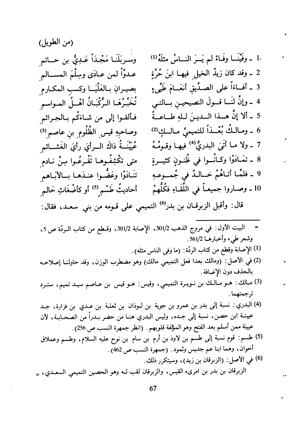 [3] مالك: هو مالك بن نويرة التميمي، وقيس: هو قيس بن عاصم سيد تميم، سترد ترجمتهما.
