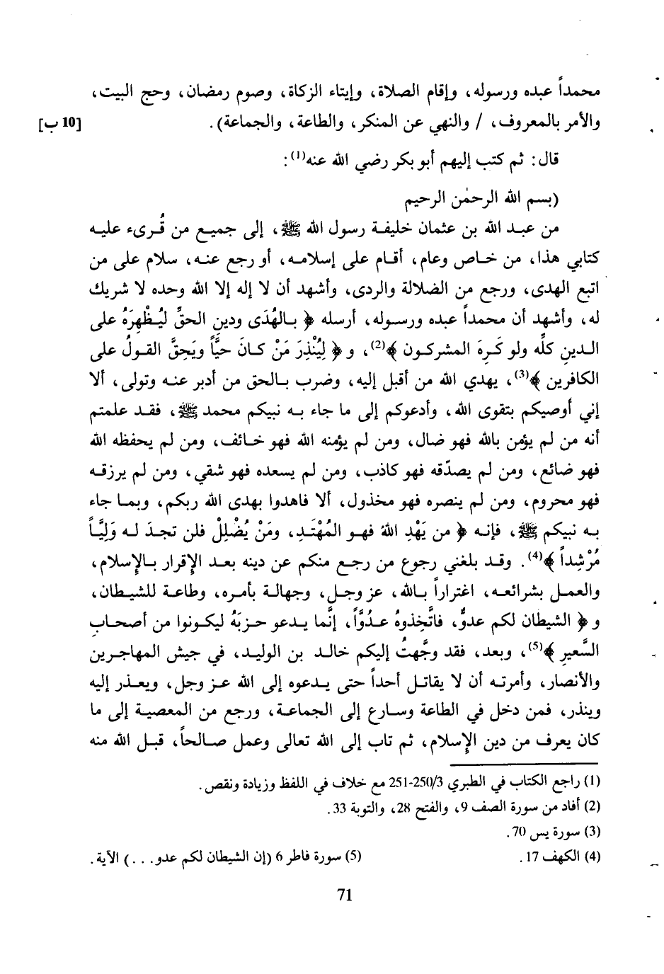 (بِسْمِ اللَّهِ الرَّحْمَنِ الرَّحِيمِ مِنْ عبد الله بن عثمان خليفة رسول الله صلّى الله عليه وآله وَسَلَّمَ، إِلَى جَمِيعِ مَنْ قُرِئَ عَلَيْهِ كِتَابِي هَذَا، مِنْ خَاصٍّ وَعَامٍّ، أَقَامَ عَلَى إِسْلامِهِ، أَوْ رَجَعَ عَنْهُ، سَلامٌ عَلَى مَنِ اتَّبَعَ الْهُدَى، وَرَجَعَ مِنَ الضَّلالَةِ وَالرَّدَى، وَأَشْهَدُ أَنْ لا إِلَهَ إِلا اللَّهُ وَحْدَهُ لا شَرِيكَ لَهُ، وَأَشْهَدُ أَنَّ مُحَمَّدًا عَبْدُهُ وَرَسُولُهُ، أَرْسَلَهُ بِالْهُدى وَدِينِ الْحَقِّ لِيُظْهِرَهُ عَلَى الدِّينِ كُلِّهِ وَلَوْ كَرِهَ الْمُشْرِكُونَ 9: 33 [2] ، ولِيُنْذِرَ مَنْ كانَ حَيًّا وَيَحِقَّ الْقَوْلُ عَلَى الْكافِرِينَ 36: 70 [3] ، يَهْدِي اللَّهُ مَنْ أَقْبَلَ إِلَيْهِ، وَضَرَبَ بِالْحَقِّ مَنْ أَدْبَرَ عَنْهُ وَتَوَلَّى، أَلا إِنِّي أُوصِيكُمْ بِتَقْوَى اللَّهِ، وَأَدْعُوكُمْ إِلَى مَا جَاءَ بِهِ نبيكم محمد صلّى الله عليه وآله وَسَلَّمَ، فَقَدْ عَلِمْتُمْ أَنَّهُ مَنْ لَمْ يُؤْمِنْ باللَّه فَهُوَ ضَالٌّ، وَمَنْ لَمْ يُؤَمِّنْهُ اللَّهُ فَهُوَ خَائِفٌ، وَمَنْ لَمْ يَحْفَظْهُ اللَّهُ فَهُوَ ضَائِعٌ، وَمَنْ لَمْ يُصَدِّقْهُ فَهُوَ كَاذِبٌ، وَمَنْ لَمْ يُسْعِدْهُ فَهُوَ شَقِيٌّ، وَمَنْ لَمْ يَرْزُقْهُ فَهُوَ مَحْرُومٌ، وَمَنْ لَمْ يَنْصُرْهُ فَهُوَ مَخْذُولٌ، أَلا فَاهْدُوا بِهُدَى اللَّهِ رَبِّكُمْ، وَبِمَا جَاءَ به نبيكم صلّى الله عليه وآله وسلّم، فإنه من يَهْدِ الله فَهُوَ الْمُهْتَدِ، وَمن يُضْلِلْ فَلَنْ تَجِدَ لَهُ وَلِيًّا مُرْشِداً 18: 17 [4] . وَقَدْ بَلَغَنِي رُجُوعُ مَنْ رَجَعَ مِنْكُمْ عَنْ دِينِهِ بَعْدَ الإِقْرَارِ بِالإِسْلامِ، وَالْعَمَلِ بِشَرَائِعِهِ، اغْتِرَارًا باللَّه، عَزَّ وَجَلَّ، وَجَهَالَةً بِأَمْرِهِ، وَطَاعَةً لِلشَّيْطَانِ، والشَّيْطانَ لَكُمْ عَدُوٌّ، فَاتَّخِذُوهُ عَدُوًّا، إِنَّما يَدْعُوا حِزْبَهُ لِيَكُونُوا من أَصْحابِ السَّعِيرِ 35: 6 [5] ، وَبَعْدُ، فَقَدْ وَجَّهْتُ إِلَيْكُمْ خَالِدَ بْنَ الْوَلِيدِ، فِي جَيْشِ الْمُهَاجِرِينَ وَالأَنْصَارِ، وَأَمَرْتُهُ أَنْ لا يُقَاتِلَ أَحَدًا حَتَّى يَدْعُوهُ إِلَى اللَّهِ عَزَّ وَجَلَّ، وَيَعْذِرُ إِلَيْهِ وَيُنْذِرُ، فَمَنْ دَخَلَ فِي الطَّاعَةِ وَسَارَعَ إِلَى الْجَمَاعَةِ، وَرَجَعَ مِنَ الْمَعْصِيَةِ إِلَى مَا كَانَ يَعْرِفُ مِنْ دِينِ الإِسْلامِ، ثُمَّ تَابَ إِلَى اللَّهِ تَعَالَى وَعَمِلَ صَالِحًا، قبل الله منه