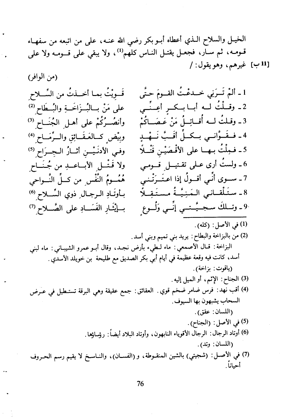 2- وَقُلْتُ لَهُ أَبَا بَكْرٍ أَعِنِّي ... عَلَى مَنْ بِالْبُزَاخَةِ وَالْبِطَاحِ [2]