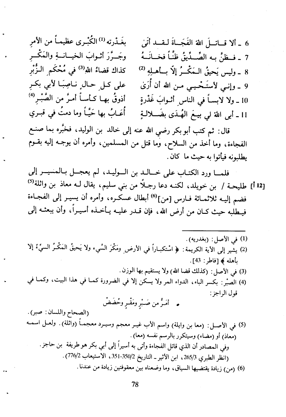 فَلَمَّا وَرَدَ الْكِتَابُ عَلَى خَالِدِ بْنِ الْوَلِيدِ، لَمْ يُعَجِّلْ بالمسير إلى [12 أ] طُلَيْحَةَ/ بْنِ خُوَيْلِدٍ، لَكِنَّهُ دَعَا رَجُلا مِنْ بَنِي سُلَيْمٍ، يُقَالُ لَهُ مُعَاذُ بْنُ وَاثِلَةَ [5] فضم إليه ثلاثمائة فَارِسٍ [مِنْ] [6] أَبْطَالِ عَسْكَرِهِ، وَأَمَرَهُ أَنْ يَسِيرَ إِلَى الْفُجَاءَةِ فَيَطْلُبَهُ حَيْثُ كَانَ مِنْ أَرْضِ اللَّهِ، فَإِنْ قَدَرَ عَلَيْهِ يَأْخُذُهُ أَسِيرًا، وَأَنْ يبعثه إلى