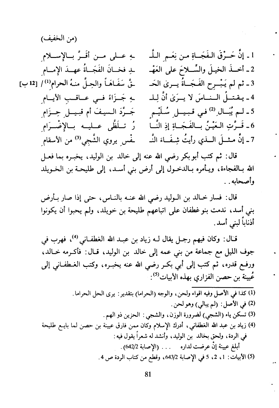 قَالَ: وَكَانَ فِيهِمْ رَجُلٌ يُقَالُ لَهُ زِيَادُ بْنُ عَبْدِ اللَّهِ الْغَطَفَانِيُّ [4] ، فَهَرَبَ فِي جَوْفِ اللَّيْلِ مَعَ جَمَاعَةٍ مِنْ بَنِي عَمِّهِ إِلَى خَالِدِ بْنِ الْوَلِيدِ، قَالَ: فَأَكْرَمَهُ خَالِدٌ، وَرَفَعَ قَدْرَهُ، ثُمَّ كَتَبَ إِلَى أَبِي بَكْرٍ رَضِيَ اللَّهُ عَنْهُ يُخْبِرُهُ، وَكَتَب الْغَطَفَانِيُّ إِلَى عُيَيْنَةَ بْنِ حصن الفزاري بهذه الأبيات [5] :