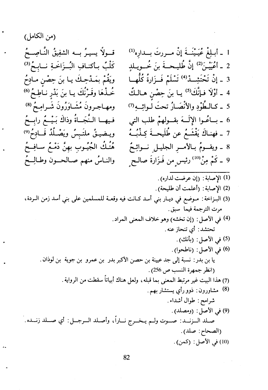 2- أَعُيَيْنُ [2] إنَّ طُلَيْحَةَ بْنَ خُوَيْلِدٍ ... كَلْبٌ بِأَكْنَافِ الْبُزَاخَةِ نَابِحُ [3]