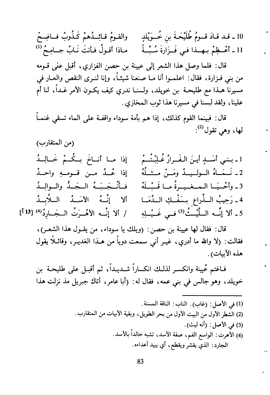 [4] [13 أ] قَالَ: فَقَالَ لَهَا عُيَيْنَةُ بْنُ حِصْنٍ: (وَيْلَكِ يَا سَوْدَاءُ، مَنْ يَقُولُ هَذَا الشِّعْرَ) ، فَقَالَتْ: (لا وَاللَّهِ مَا أَدْرِي، غَيْرَ أَنِّي سَمِعْتُ دَوِيًّا مِنْ هَذَا الْغَدِيرِ، وَقَائِلا يَقُولُ هَذِهِ الأَبْيَاتَ) .