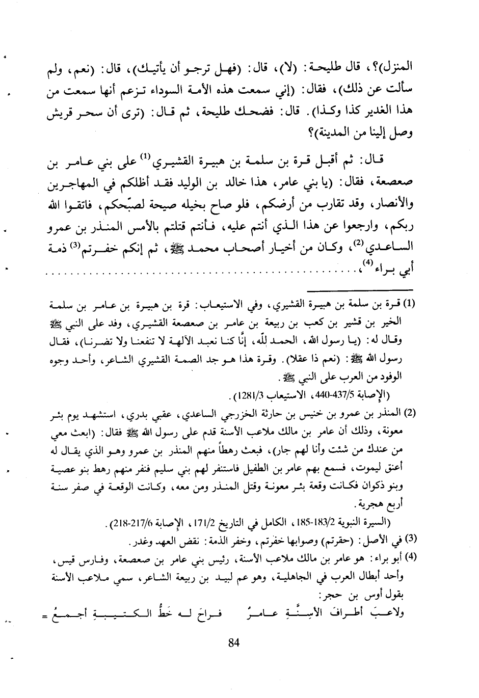 قَالَ: ثُمَّ أَقْبَلَ قُرَّةُ بْنُ سَلَمَةَ بْنِ هُبَيْرَةَ الْقُشَيْرِيُّ [1] عَلَى بَنِي عَامِرِ بْنِ صَعْصَعَةَ، فَقَالَ: (يَا بَنِي عَامِرٍ، هَذَا خَالِدُ بْنُ الْوَلِيدِ فَقَدْ أَظَلَّكُمْ فِي الْمُهَاجِرِينَ وَالأَنْصَارِ، وَقَدْ تَقَارَبَ مِنْ أَرْضِكُمْ، فَلَوْ صَاحَ بِخَيْلِهِ صَيْحَةً لَصَبَّحَكُمْ، فَاتَّقُوا اللَّهَ رَبَّكُمْ، وَارْجِعُوا عَنْ هَذَا الَّذِي أَنْتُمْ عَلَيْهِ، فَأَنْتُمْ قَتَلْتُمْ بِالأَمْسِ الْمُنْذِرَ بْنَ عَمْرٍو السَّاعِدِيَّ [2] ، وَكَانَ مِنْ أَخْيَارِ أَصْحَابِ محمد صلّى الله عليه وآله وَسَلَّمَ، ثُمَّ إِنَّكُمْ خَفَرْتُمْ [3] ذِمَّةَ أَبِي بَرَاءٍ [4] ،............... ............... ............... ............... .....