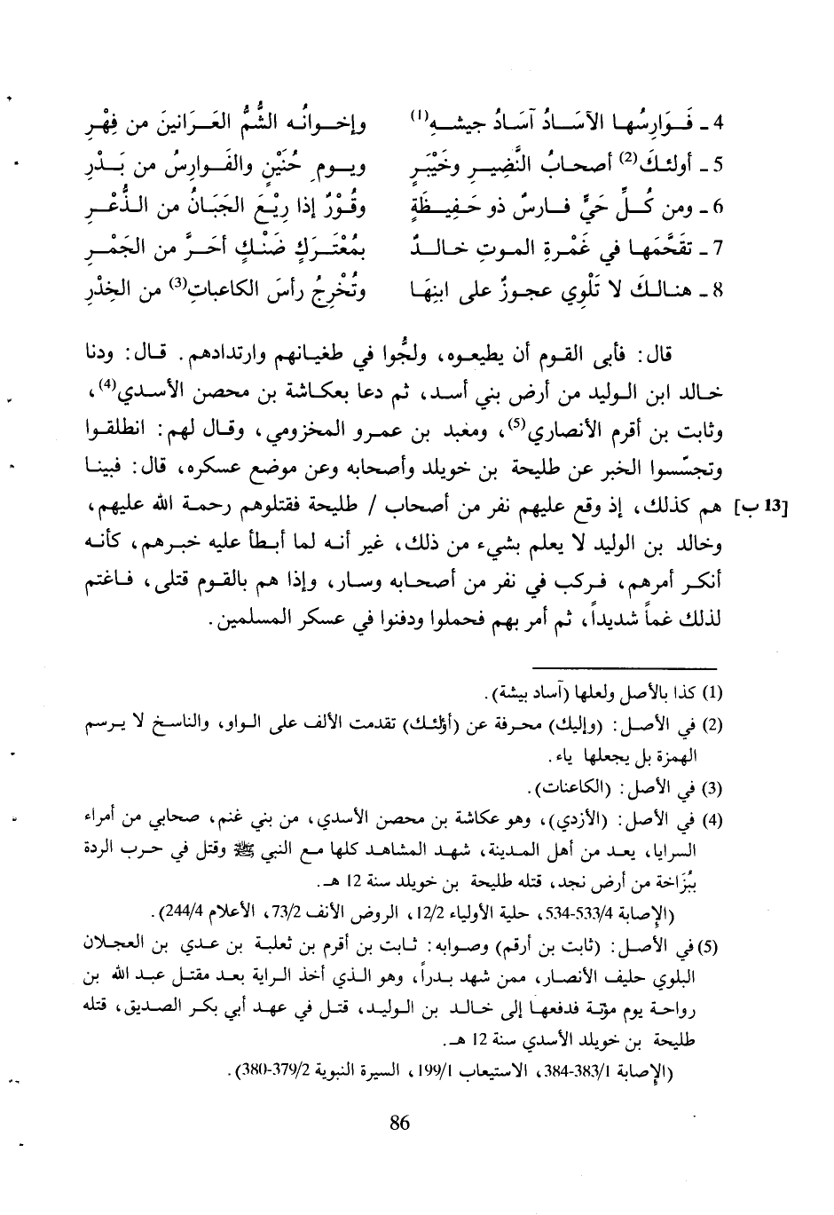 [4] في الأصل: (الأزدي) ، وهو عكاشة بن محصن الأسدي، من بني غنم، صحابي من أمراء السرايا، يعد من أهل المدينة، شهد المشاهد كلها مع النبي صلّى الله عليه وآله وسلّم وقتل في حرب الردة ببزاخة من أرض نجد، قتله طليحة بن خويلد سنة 12 هـ-.