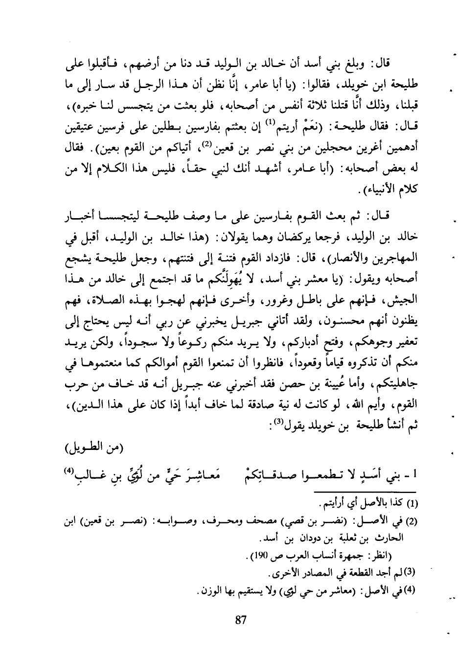 قَالَ: وَبَلَغَ بَنِي أَسَدٍ أَنَّ خَالِدَ بْنَ الْوَلِيدِ قَدْ دَنَا مِنْ أَرْضِهِمْ، فَأَقْبَلُوا عَلَى طليحة ابن خُوَيْلِدٍ، فَقَالُوا: (يَا أَبَا عَامِرٍ، إِنَّا نَظُنُّ أَنَّ هَذَا الرَّجُلَ قَدْ سَارَ إِلَى مَا قَبْلَنَا، وَذَلِكَ أنَّا قَتَلْنَا ثَلاثَةَ أَنْفُسٍ مِنْ أَصْحَابِهِ، فَلَوْ بَعَثْتَ مَنْ يَتَجَسَّسُ لَنَا خَبَرَهُ) ، قال: فقال طليحة: (نعم أريتم [1] إِنْ بَعَثْتُمْ بِفَارِسَيْنِ بَطَلَيْنِ عَلَى فَرَسَيْنِ عَتِيقَيْنِ أَدْهَمَيْنِ أَغَرَّيْنِ مُحَجَّلِينَ مِنْ بَنِي نَصْرِ بْنِ قُعَيْنٍ [2] ، أَتَيَاكُمْ مِنَ الْقَوْمِ بِعَيْنٍ) . فَقَالَ لَهُ بَعْضُ أَصْحَابِهِ: (أَبَا عَامِرٍ، أَشْهَدُ أَنَّكَ لَنَبِيٍّ حَقًّا، فَلَيْسَ هَذَا الْكَلامُ إِلا مِنْ كَلامِ الأَنْبِيَاءِ) .