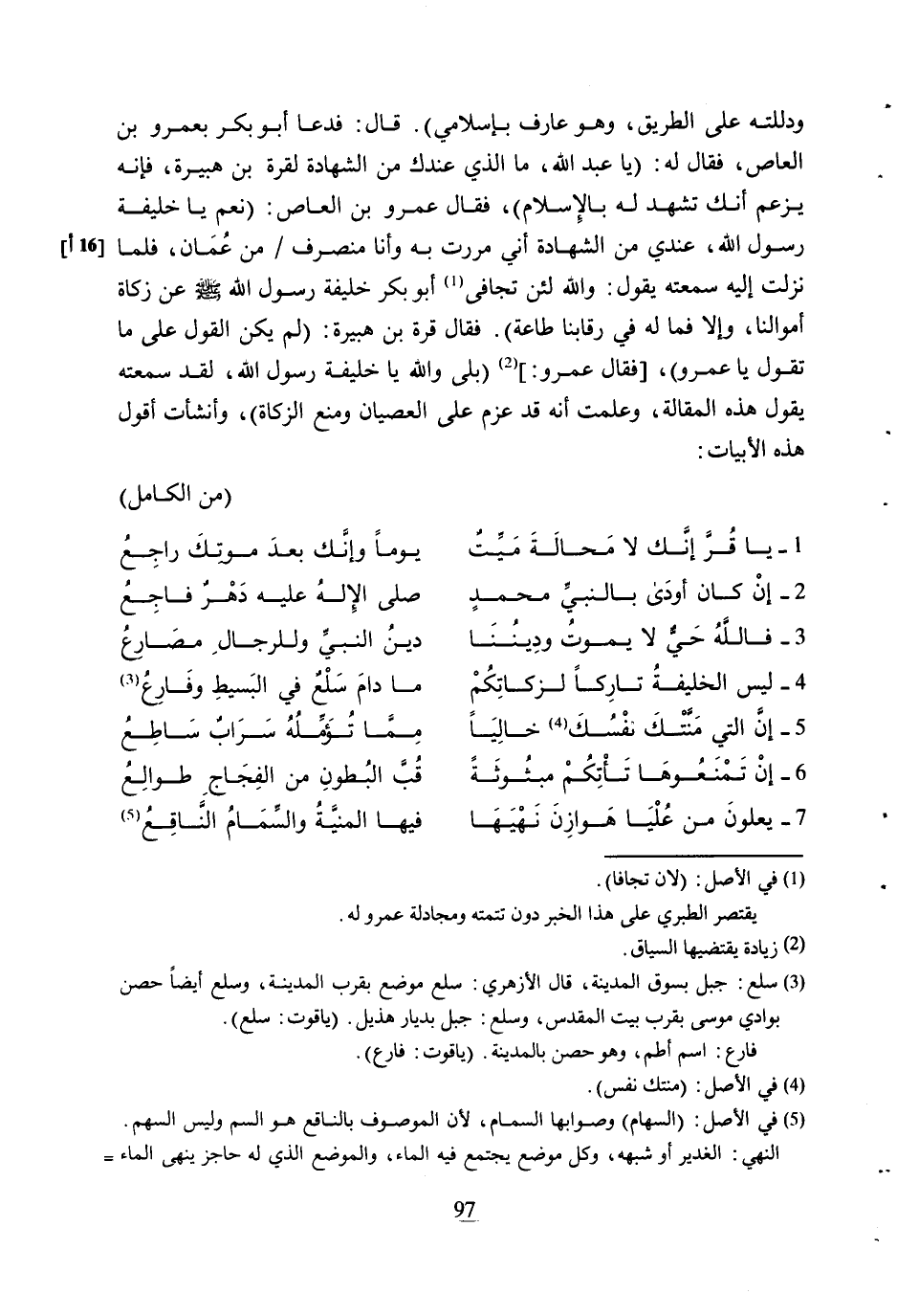 وَدَلَلْتُهُ عَلَى الطَّرِيقِ، وَهُوَ عَارِفٌ بِإِسْلامِي) . قَالَ: فَدَعَا أَبُو بَكْرٍ بِعَمْرِو بْنِ الْعَاصِ، فَقَالَ لَهُ: (يَا عَبْدَ اللَّهِ، مَا الَّذِي عِنْدَكَ مِنَ الشَّهَادَةِ لِقُرَّةَ بْنِ هُبَيْرَةَ، فَإِنَّهُ يَزْعُمُ أَنَّكَ تَشْهَدُ لَهُ بِالإِسْلامِ) ، فَقَالَ عَمْرُو بْنُ الْعَاصِ: (نَعَمْ يَا خَلِيفَةَ رَسُولِ اللَّهِ، عِنْدِي مِنَ الشَّهَادَةِ أَنِّي مَرَرْتُ بِهِ وَأَنَا مُنْصَرِفٌ/ من عمان، فلما [16 أ] نَزَلْتُ إِلَيْهِ سَمِعْتُهُ يَقُولُ: وَاللَّهِ لَئِنْ تَجَافَى [1] أَبُو بَكْرٍ خَلِيفَةُ رَسُولِ اللَّهِ صَلَّى اللَّهُ عليه وآله وَسَلَّمَ عَنْ زَكَاةِ أَمْوَالِنَا، وَإِلا فَمَا لَهُ فِي رِقَابِنَا طَاعَةٌ) . فَقَالَ قُرَّةُ بْنُ هُبَيْرَةَ: (لَمْ يَكُنِ الْقَوْلُ عَلَى مَا تَقُولُ يَا عَمْرُو) ، [فَقَالَ عَمْرُو:] [2] (بَلَى وَاللَّهِ يَا خَلِيفَةَ رَسُولِ اللَّهِ، لَقَدْ سَمِعْتُهُ يَقُولُ هَذِهِ الْمَقَالَةَ، وَعَلِمْتُ أَنَّهُ قَدْ عَزَمَ عَلَى الْعِصْيَانِ وَمَنْعِ الزَّكَاةِ) ، وَأَنْشَأْتُ أَقُولُ هَذِهِ الأَبْيَاتَ: