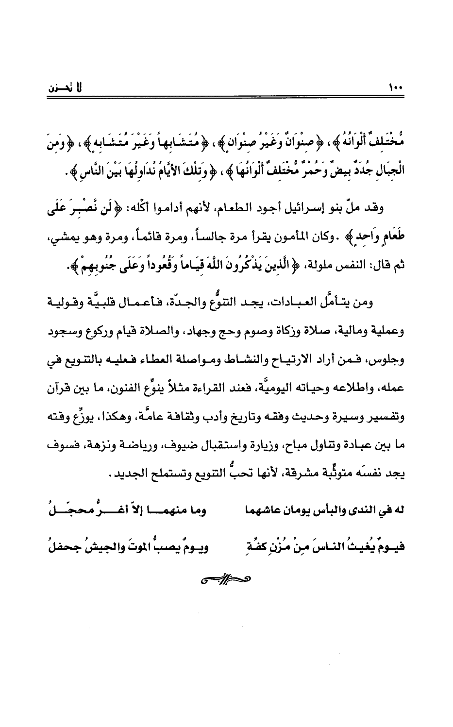 ومن يتأمَّلِ العباداتِ، يَجِدْ التنوُّعَ والجدَّةَ، فأعمالٌ قلبيَّةٌ وقوليةٌ وعمليةٌ وماليةٌ، صلاةٌ وزكاةٌ وصومٌ وحجٌّ وجهادٌ، والصلاةُ قيامٌ وركوعٌ وسجودٌ وجلوسٌ، فمنْ أراد الارتياح والنشاط ومواصلةَ العطاءِ فعليهِ بالتنويعِ في عملِهِ، واطلاعِهِ وحياتِهِ اليوميَّةِ، فعندَ القراءةِ مثلاً ينوِّعُ الفنونَ، ما بين قرآنٍ وتفسيرٍ وسيرةٍ وحديثٍ وفقهٍ وتاريخٍ وأدبٍ وثقافةٍ عامَّةٍ، وهكذا، يوزِّع وقته ما بين عبادةٍ وتناولِ مباحٍ، وزيادةٍ واستقبالِ ضيوفٍ، ورياضةٍ ونزهةٍ، فسوفَ يجدُ نفسَهُ متوثِّبةً مشرقةً؛ لأنها تحبُّ التنويعَ وتستملحُ الجديدَ.