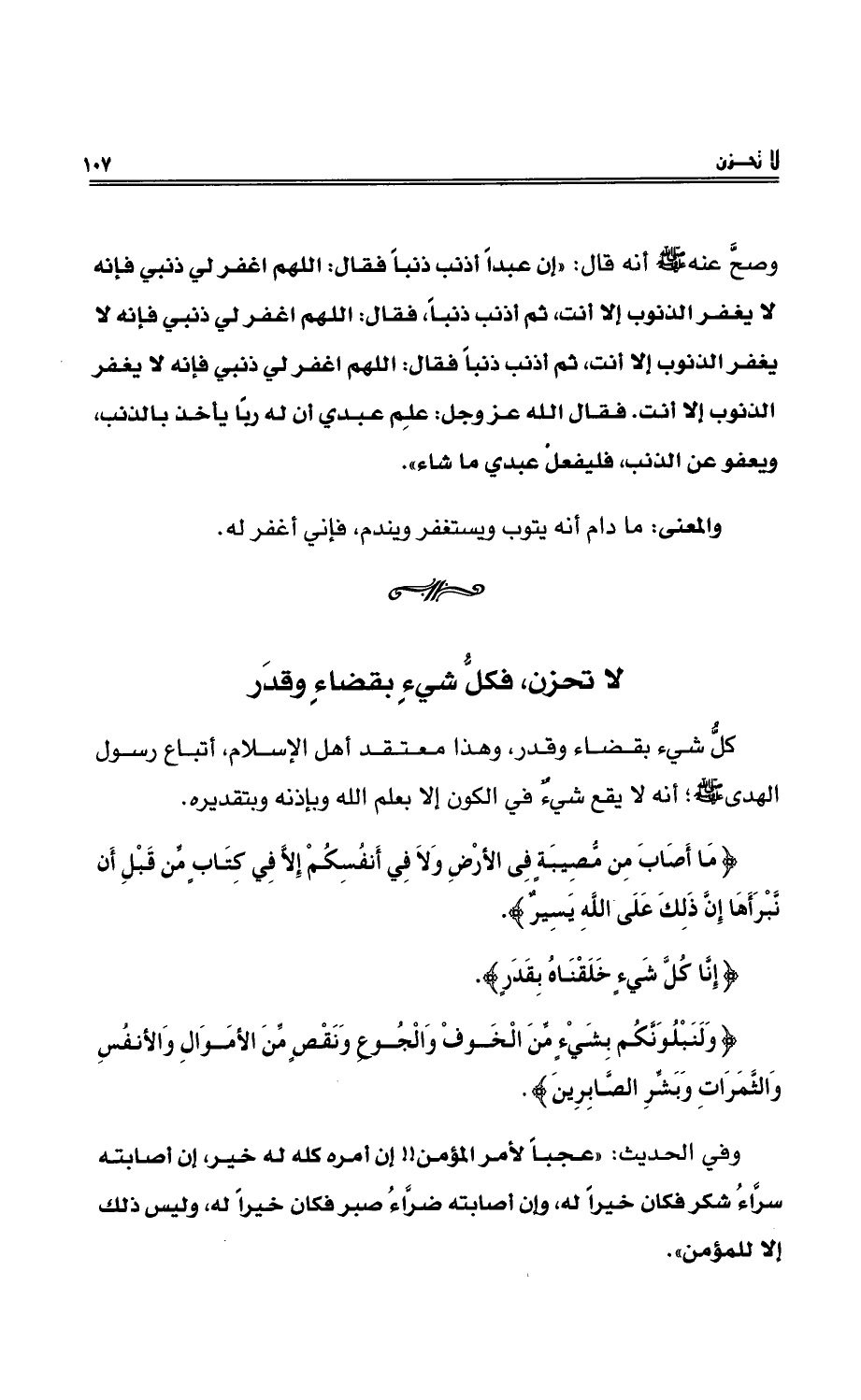 وصحَّ عنه - صلى الله عليه وسلم - أنه قالَ: ((إنَّ عبداً أذنب ذنباً فقال: اللهم اغفرْ لي ذنبي فإنهُ لا يغفرُ الذنوبَ إلا أنت، ثم أذنب ذنباً، فقال: اللهمَّ اغفرْ لي ذنبي فإنه لا يغفرُ الذنوبَ إلا أنت، ثم أذنب ذنباً، فقال: اللهمَّ اغفرْ لي ذنبي فإنه لا يغفرُ الذنوبَ إلا أنت. فقال اللهُ عزَّ وجلَّ علِمَ عبدي أنَّ له ربّاً يأخذُ بالذنبِ، ويعفو عن الذنبِ، فليفعلْ عبدي ما شاء)) .
