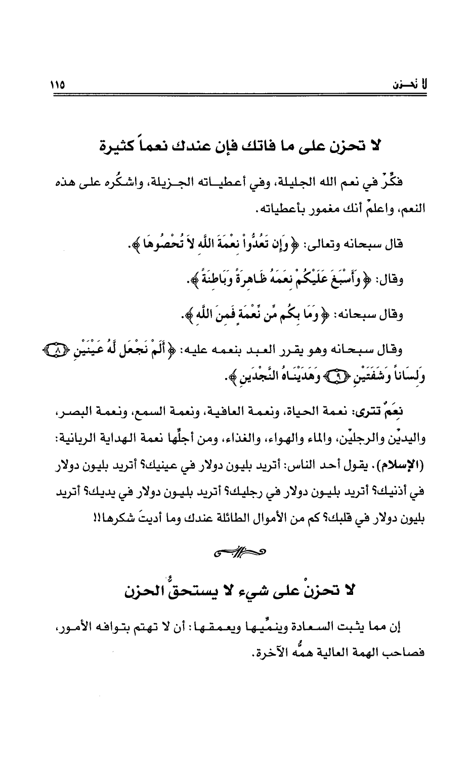 نِعَمٌ تَتْرَى: نعمةُ الحياةِ، ونعمةُ العافيةِ، ونعمةُ السمعِ، ونعمةُ البصرِ، واليدينِ والرجليْن، والماءِ والهواءِ، والغذاءِ، ومن أجلِّها نعمةُ الهدايةِ الربانية: (الإسلاَمُ) . يقولُ أحدُ الناسِ: أتريدُ بليون دولار في عينيك؟ أتريُد بليون دولارٍ في أذنيك؟ أتريدُ بليون دولار في رجليك؟ أتريدُ بليون دولارٍ في يديك؟ أتريدُ بليون دولارٍ في قلبك؟ كمْ من الأموالِ الطائلةِ عندك وما أديتَ شُكْرَها!! .