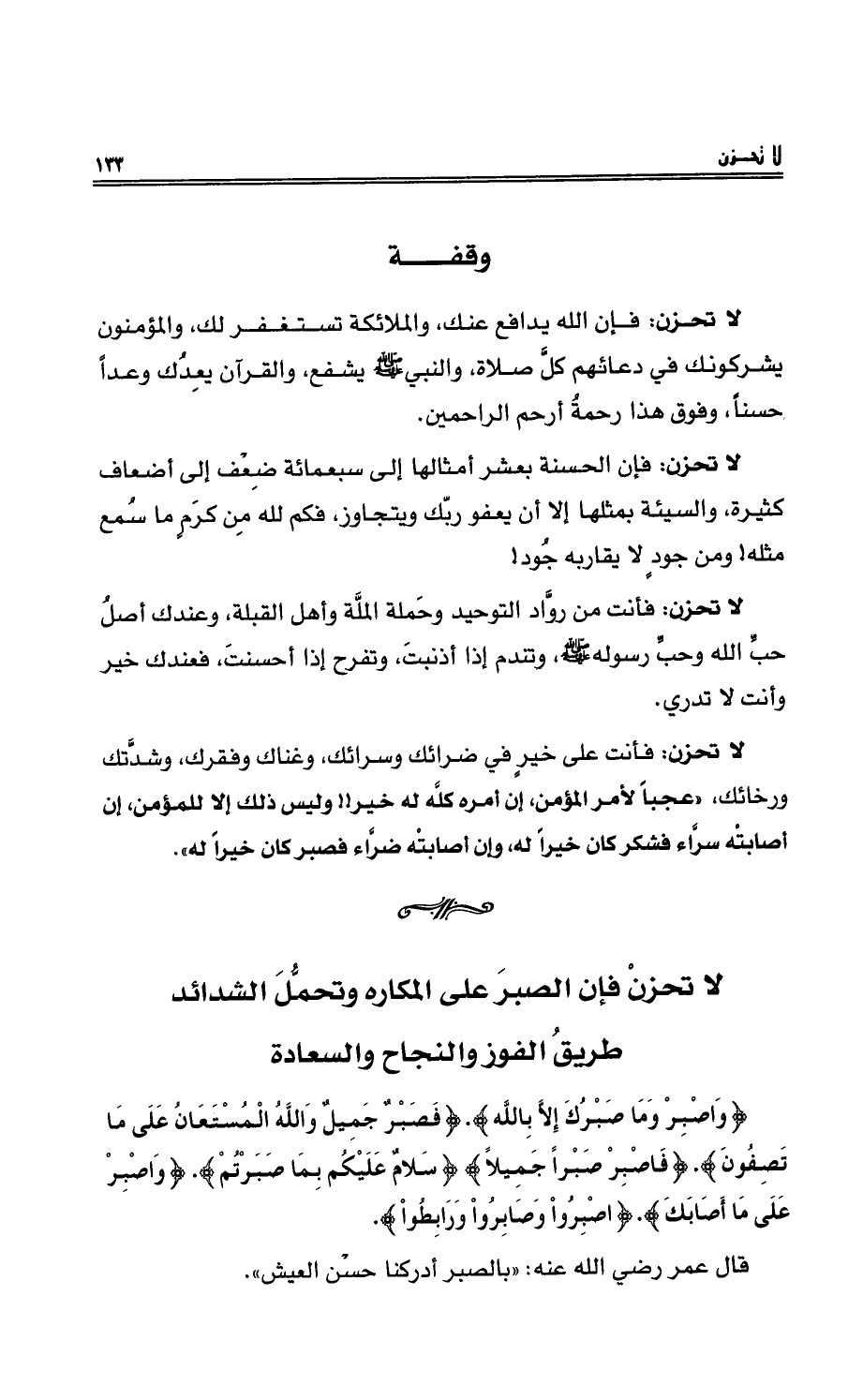 لا تحزنْ: فأنت على خيرٍ في ضرائِك وسرائِك، وغناك وفقرِك، وشدَّتِك ورخائِك، ((عجباً لأمرِ المؤمنِ، إنَّ أمرهَ كلَّه له خيرٌ، وليسَ ذلك إلا للمؤمنِ، نْ أصابْته سرَّاءَ فشكر كان خيراً له، وإنْ أصابتْه ضرَّاءُ فصبر فكان خيراً له)) .
