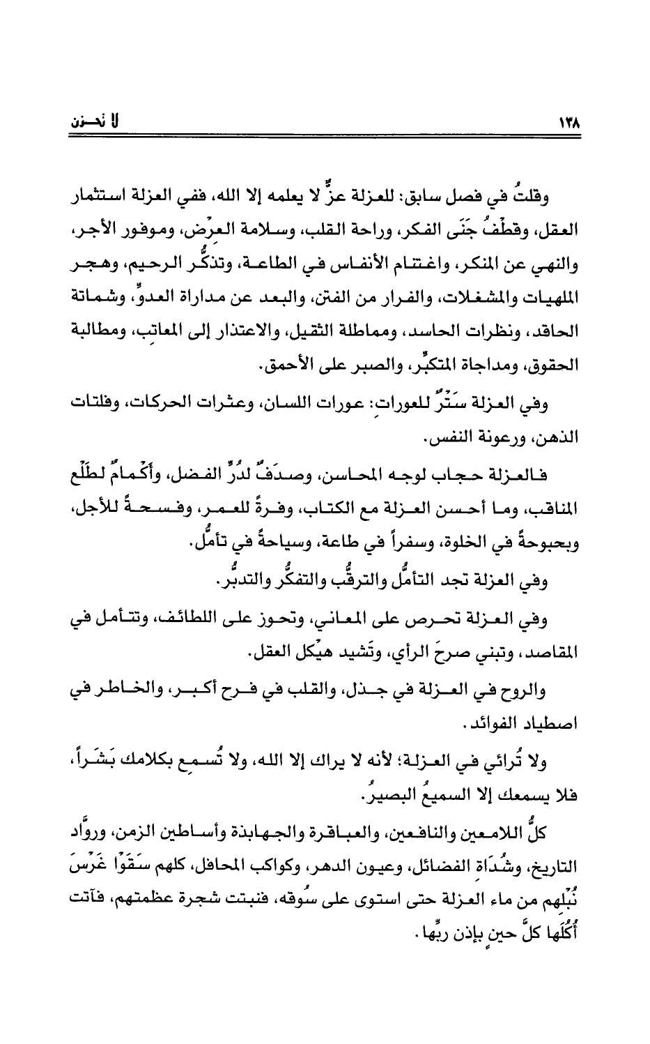 وفي العزلةِ استثمارُ العقلِ، وقطْفُ جَنَى الفكرِ، وراحةُ القلبِ، وسلامةُ العرْض، وموفورُ الأجرِ، والنهيُ عن المنكر، واغتنامُ الأنفاسِ في الطاعةِ، وتذكُّرُ الرحيمِ، وهجرُ الملهياتِ والمشغلاتِ، والفرارُ من الفتنِ، والبعدُ عن مداراةِ العدوِّ، وشماتةِ الحاقدِ، ونظراتِ الحاسدِ، ومماطلةِ الثقيلِ، والاعتذارِ على المعاتِبِ، ومطالبةِ الحقوقِ، ومداجاةِ المتكبِّرِ، والصبرِ على الأحمقِ.