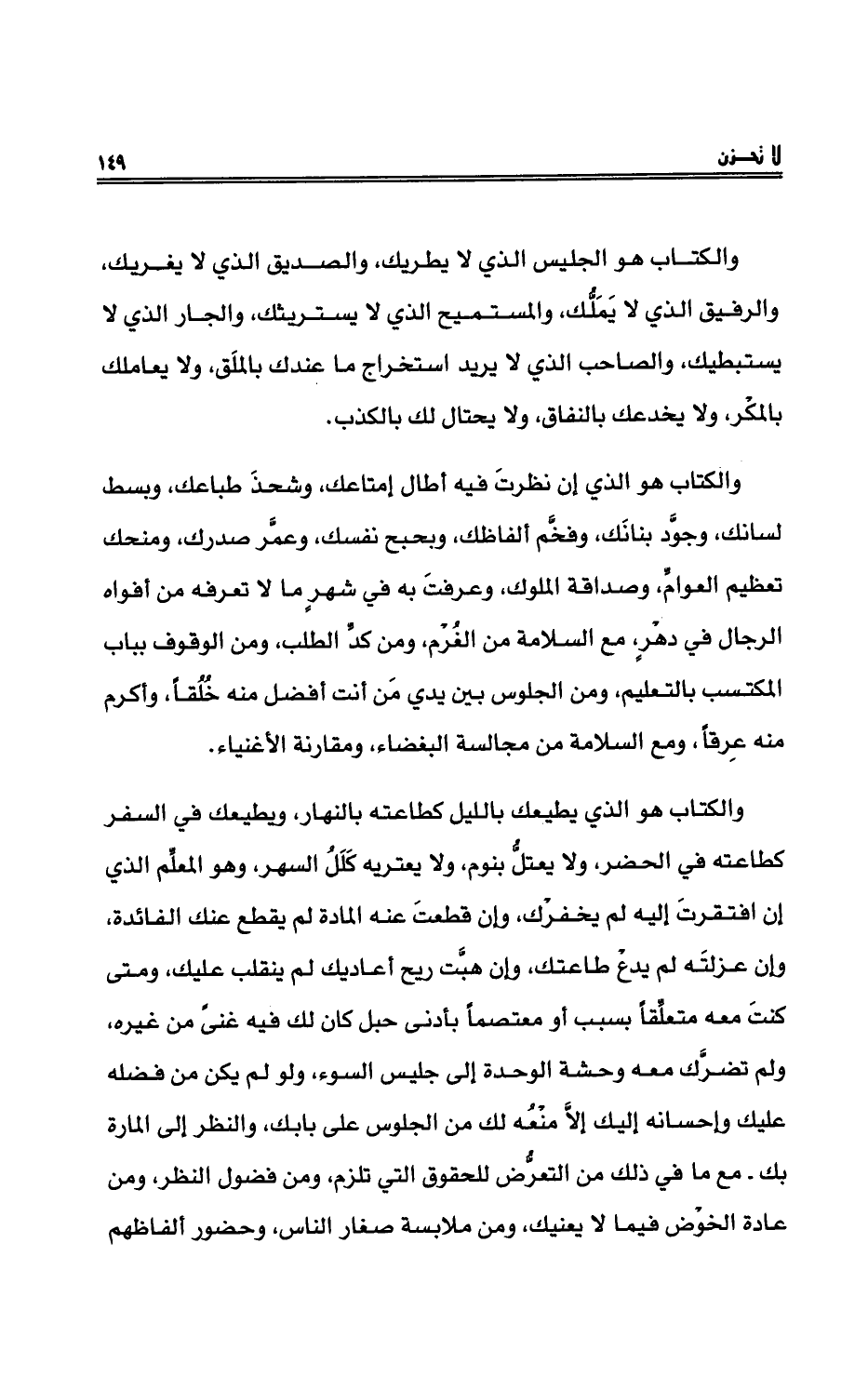 والكتاب هو الذي يطيعك بالليل كطاعته بالنهار، ويطيعك في السفر كطاعته في الحضَرِ، ولا يعتلُّ بنومٍ، ولا يعتريهِ كَلَلُ السهرِ، وهو المعلِّمُ الذي إن افتقرت إليه لم يخْفِرْك، وإن قطعت عنه المادة لم يقطعْ عنك الفائِدةَ، وإن عزلته لم يدعْ طاعتك، وإن هبَّت ريحُ أعاديك لم ينقلبْ عليك، ومتى كنت معه متعلِّقاً بسبب أو معتصماً بأدنى حبْل كان لك فيه غنىً من غيره، ولم تضرَّك معه وحشةُ الوحدة إلى جليسِ السوءِ، ولو لم يكن من فضله عليك وإحسانه إليك إلاَّ منْعُه لك من الجلوس على بابِك، والنظرُ إلى المارة بك. مع ما في ذلك من التعرُّض للحقوق التي تلزم، ومن فضولِ النظرِ، ومن عادةِ الخوْضِ فيما لا يعنيك، ومن ملابسةِ صغارِ الناسِ، وحضورِ ألفاظهم