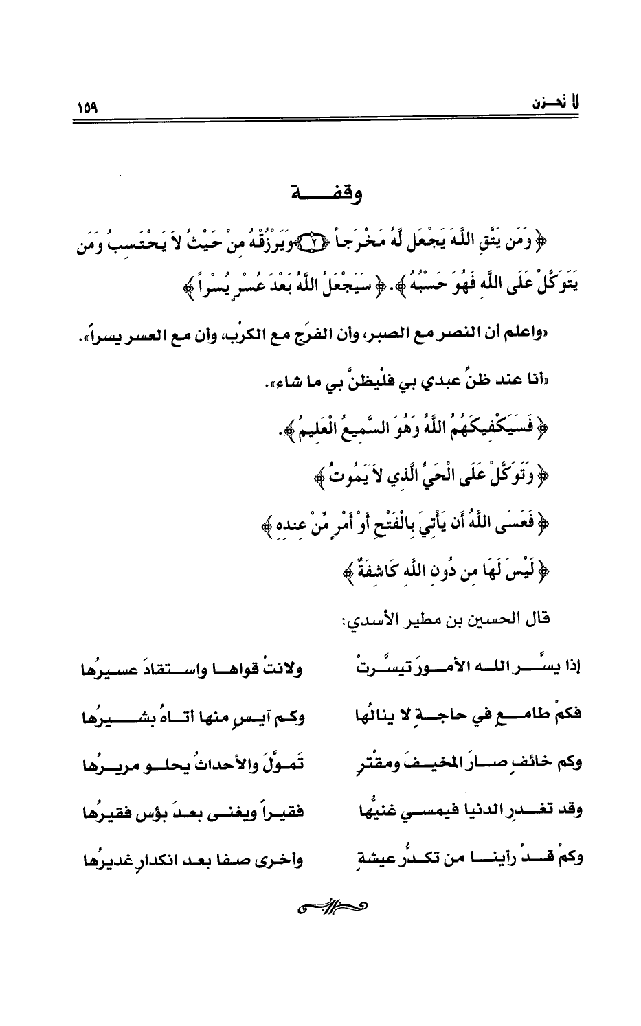 {وَمَن يَتَّقِ اللَّهَ يَجْعَل لَّهُ مَخْرَجاً {2} وَيَرْزُقْهُ مِنْ حَيْثُ لَا يَحْتَسِبُ وَمَن يَتَوَكَّلْ عَلَى اللَّهِ فَهُوَ حَسْبُهُ} . {سَيَجْعَلُ اللَّهُ بَعْدَ عُسْرٍ يُسْراً} .