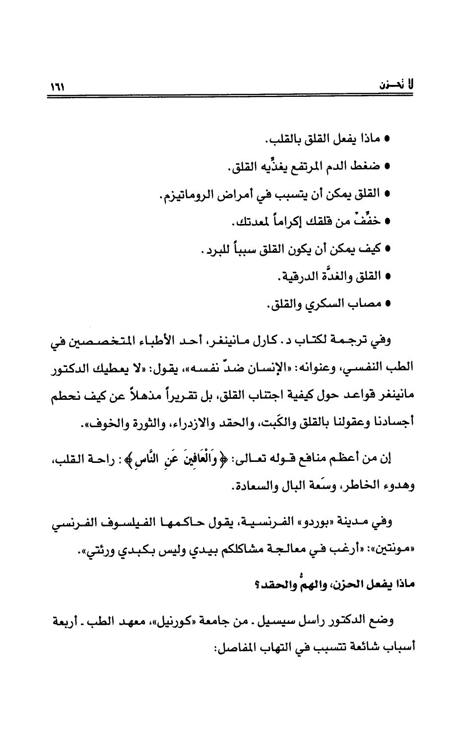 وفي ترجمة لكتاب د. كارل مانينغر، أحد الأطباء المتخصصين في الطبِ النفسي، وعنوانه: ((الإنسان ضدّ نفسه)) ، يقول: ((لا يعطيك الدكتور مانينغر قواعدَ حولَ كيفيةِ اجتنابِ القلقِ، بل تقريراً مذهلاً عن كيف نحطمُ أجسادنا وعقولنا بالقلقِ والكبْتِ، والحقدِ والازدراءِ، والثورةِ والخوْفِ)) .