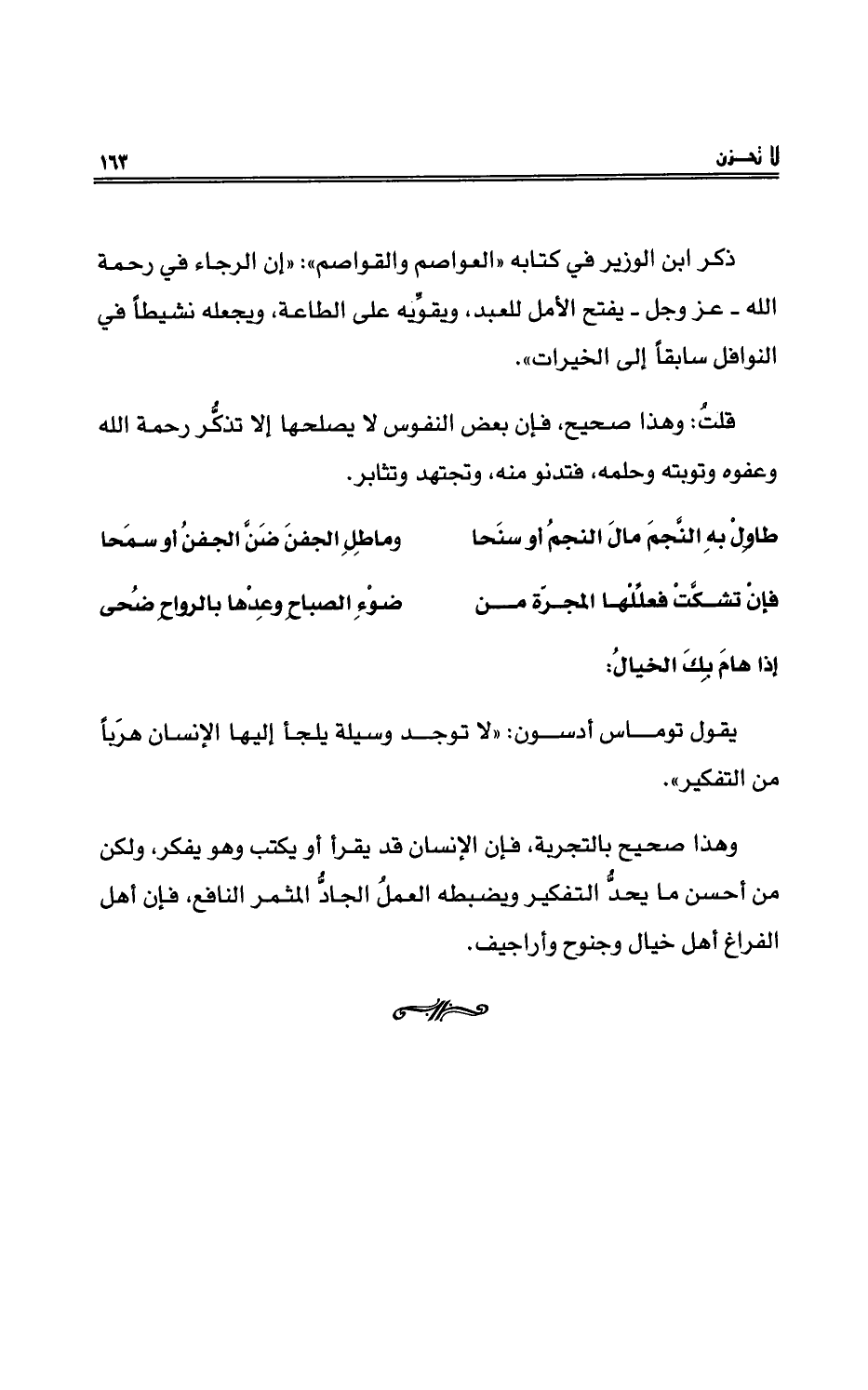 وهذا صحيح بالتجربة، فإن الإنسان قد يقرأُ أو يكتبُ وهو يفكرُ، ولكن من أحسن ما يحدُّ التفكير ويضبطه العملُ الجادُّ المثمرُ النافعُ، فإن أهل الفراغ أهلُ خيالٍ وجنوحٍ وأراجيف.