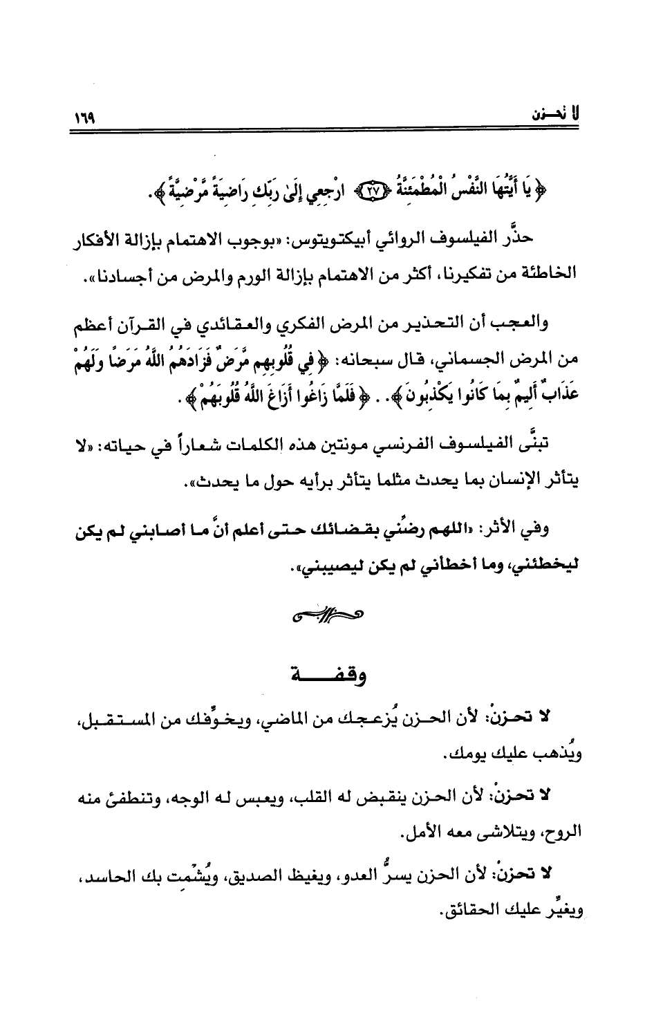 لا تحزنْ: لأنَّ الحزن يُزعجُك من الماضي، ويخوِّفك من المستقبلِ، ويُذهبُ عليك يومك.