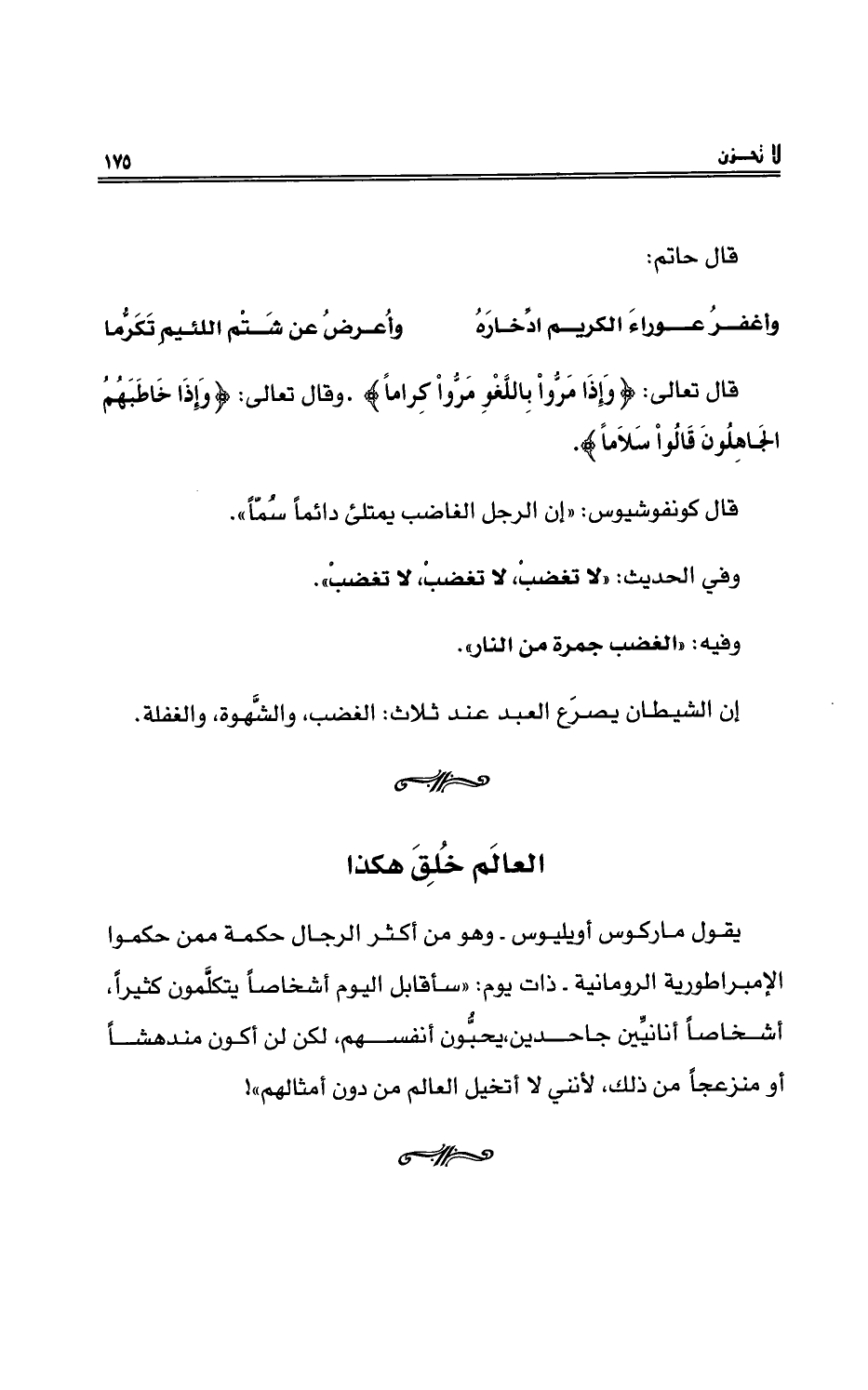 يقولُ ماركوس أويليوس - وهو من أكثر الرجالِ حكمةً ممن حكموا الإمبراطورية الرومانية - ذات يوم: «سأقابلُ اليوم أشخاصاً يتكلَّمون كثيراً، أشخاصاً أنانيِّين جاحدين، يحبُّون أنفسهم، لكن لن أكون مندهشاً أو منزعجاً من ذلك، لأنني لا أتخيلُ العالم من دونِ أمثالهم» !