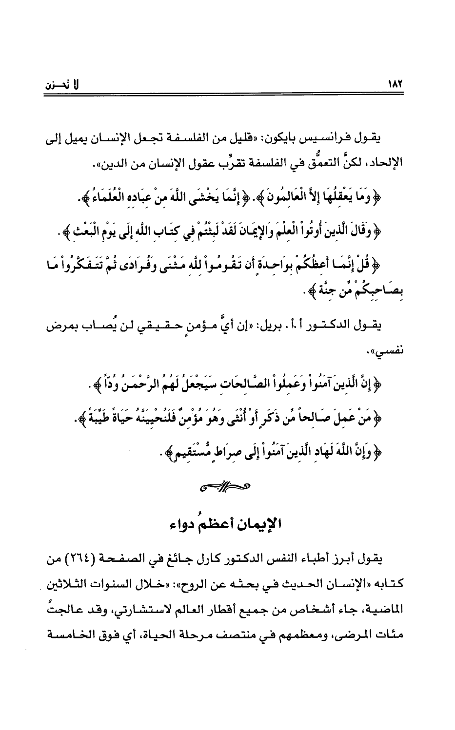 يقول أبرزُ أطباءِ النفسِ الدكتورُ كارل جائغ في الصفحة (264) من كتابِهِ «الإنسانُ الحديثُ في بحثهِ عنِ الروحِ» : «خلال السنواتِ الثلاثين الماضيةِ، جاء أشخاصٌ من جميعِ أقطارِ العالمِ لاستشارتي، وقد عالجتُ مئاتِ المرضى، ومعظمُهم في منتصفِ مرحلةِ الحياةِ، أيْ فوق الخامسةِ