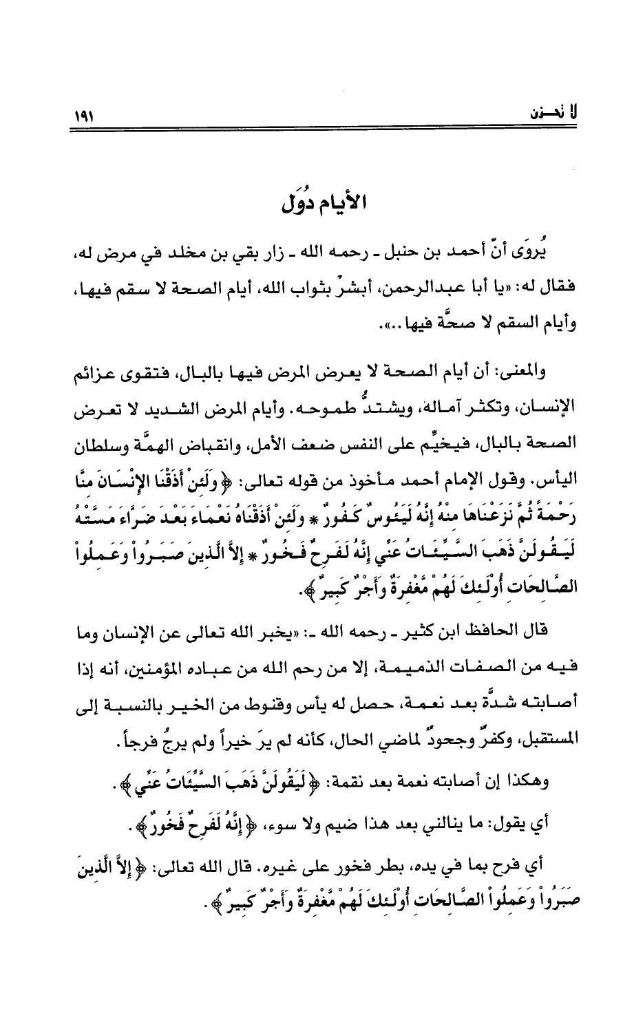 والمعنى: أن أيام الصحةِ لا يعرضُ المرضُ فيها بالبالِ، فتقوى عزائمُ الإنسانِ، وتكثر آمالُه، ويشتدُّ طموحُه. وأيامُ المرضِ الشديدِ لا تعرضُ الصحةُ بالبالِ، فيخيِّم على النفسِ ضعف الأملِ، وانقباض الهمَّةِ وسلطان اليأس. وقولُ الإمامِ أحمد مأخوذٌ من قولهِ تعالى: {وَلَئِنْ أَذَقْنَا الإِنْسَانَ مِنَّا رَحْمَةً ثُمَّ نَزَعْنَاهَا مِنْهُ إِنَّهُ لَيَؤُوسٌ كَفُورٌ {9} وَلَئِنْ أَذَقْنَاهُ نَعْمَاء بَعْدَ ضَرَّاء مَسَّتْهُ لَيَقُولَنَّ ذَهَبَ السَّيِّئَاتُ عَنِّي إِنَّهُ لَفَرِحٌ فَخُورٌ {10} إِلاَّ الَّذِينَ صَبَرُواْ وَعَمِلُواْ الصَّالِحَاتِ أُوْلَئِكَ لَهُم مَّغْفِرَةٌ وَأَجْرٌ كَبِيرٌ} .