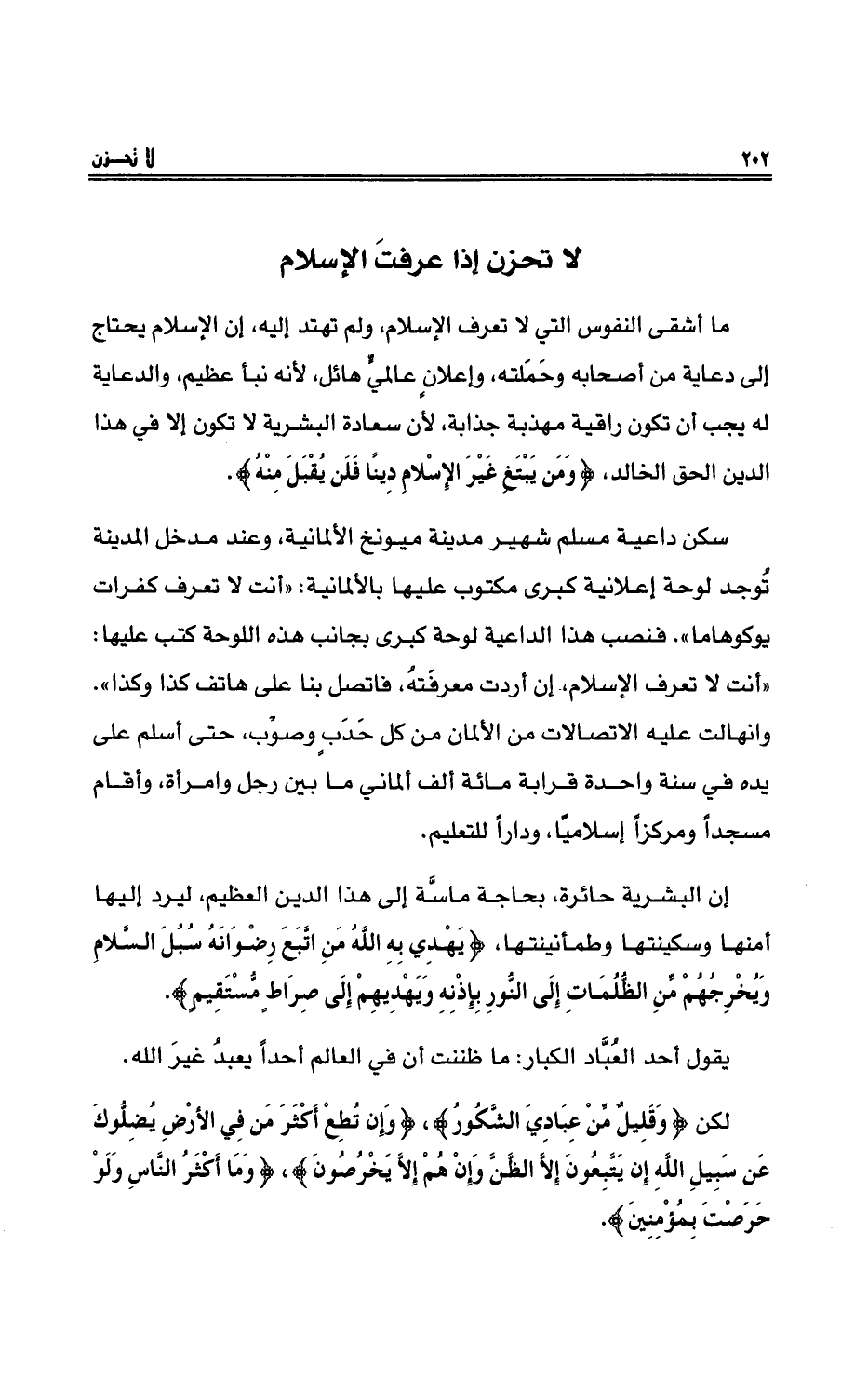 ما أشقى النفوس التي لا تعرفُ الإسلام، ولم تهتدِ إليه، إنَّ الإسلام يحتاجُ إلى دعايةٍ منْ أصحابهِ وحَمَلتِهِ، وإعلان عالميٍّ هائل، لأنهُ نبأ عظيمٌ، والدعايةُ له يجبُ أن تكون راقيةً مهذبةً جذابةً، لأنَّ سعادة البشريةِ لا تكونُ إلا في هذا الدينِ الحقِّ الخالدِ، {وَمَن يَبْتَغِ غَيْرَ الإِسْلاَمِ دِيناً فَلَن يُقْبَلَ مِنْهُ} .
