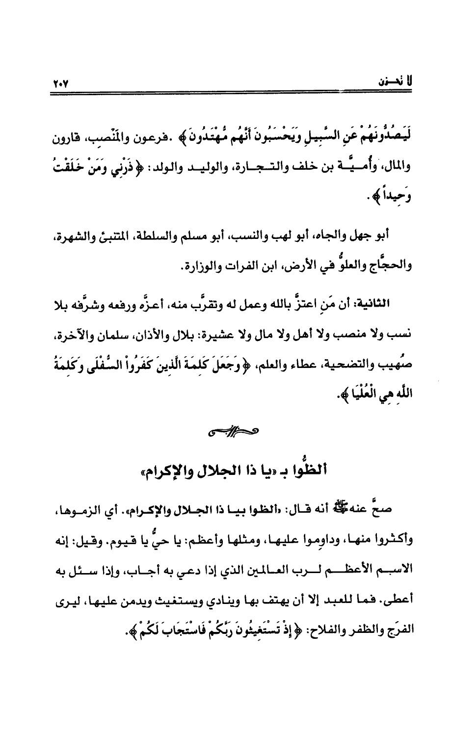 صحَّ عنه - صلى الله عليه وسلم - أنهُ قال: «ألظُّوا بيا ذا الجلالِ والإكرامِ» . أي الزموها، وأكثرُوا منها، وداوموا عليها، ومثلُها وأعظمْ: يا حيُّ يا قيومْ. وقيل: إنه الاسمُ الأعظمُ لربِّ العالمين الذين إذا دُعي به أجاب، وإذا سئل به أعطى. فما للعبدِ إلا أنْ يهتف بها وينادي ويستغيث ويدمن عليها، ليرى الفرَجَ والظفرَ والفلاحَ: {إِذْ تَسْتَغِيثُونَ رَبَّكُمْ فَاسْتَجَابَ لَكُمْ} .