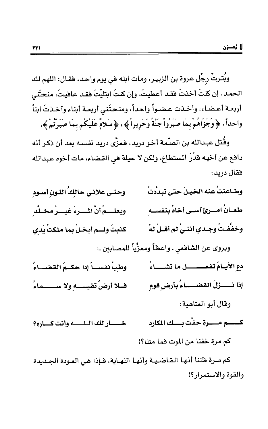 وبُترتْ رِجْلُ عروة بن الزبيرِ، ومات ابنُه في يومٍ واحداً، فقال: اللهمَّ لِك الحمْد، إنْ كنت أخذت فقدْ أعطيْت، وإنْ كنت ابتليْتَ فقدْ عافيْت، منحتني أربعة أعضاءِ، وأخذت عضواً واحداً، ومنحتني أربعة أبناءٍ وأخذت ابناً واحداً. {وَجَزَاهُم بِمَا صَبَرُوا جَنَّةً وَحَرِيراً} ، {سَلاَمٌ عَلَيْكُم بِمَا صَبَرْتُمْ} .