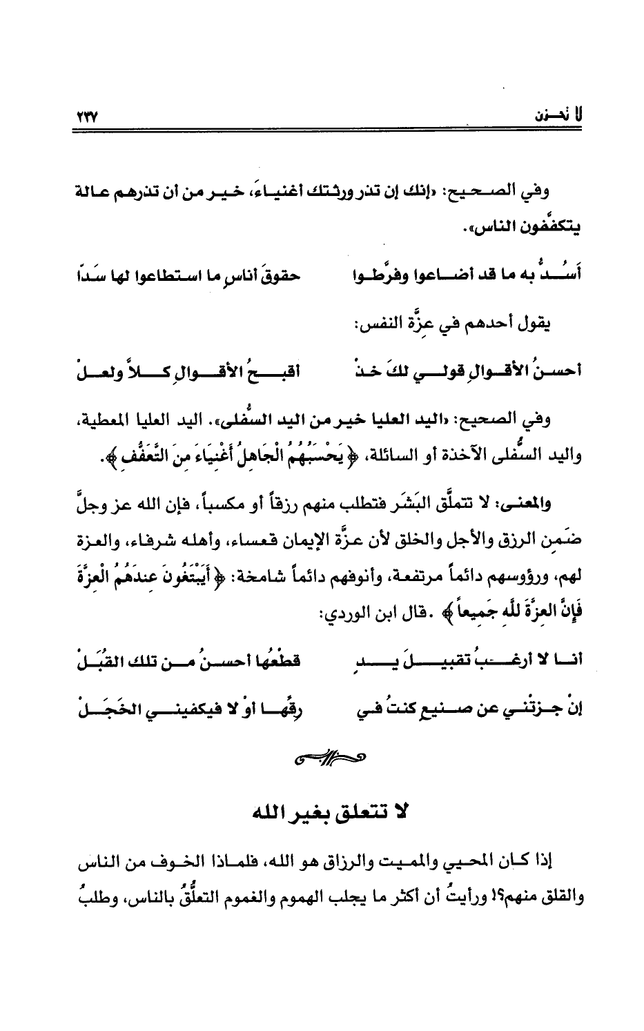 والمعنى: لا تتملَّق البشرَ فتطلب منهمْ رزقاً أو مكسباً، فإنَّ الله عزَّ وجلَّ ضمِنَ الرزق والأجلَ والخلْقَ لأنَّ عزَّةَ الإيمانِ قعساءُ، وأهلُه شرفاءُ، والعزةُ لهم، ورؤوسُهم دائماً مرتفعةٌ، وأنوفُهم دائماً شامخةٌ: {أَيَبْتَغُونَ عِندَهُمُ الْعِزَّةَ فَإِنَّ العِزَّةَ لِلّهِ جَمِيعاً} . قال ابنُ الورديُّ: