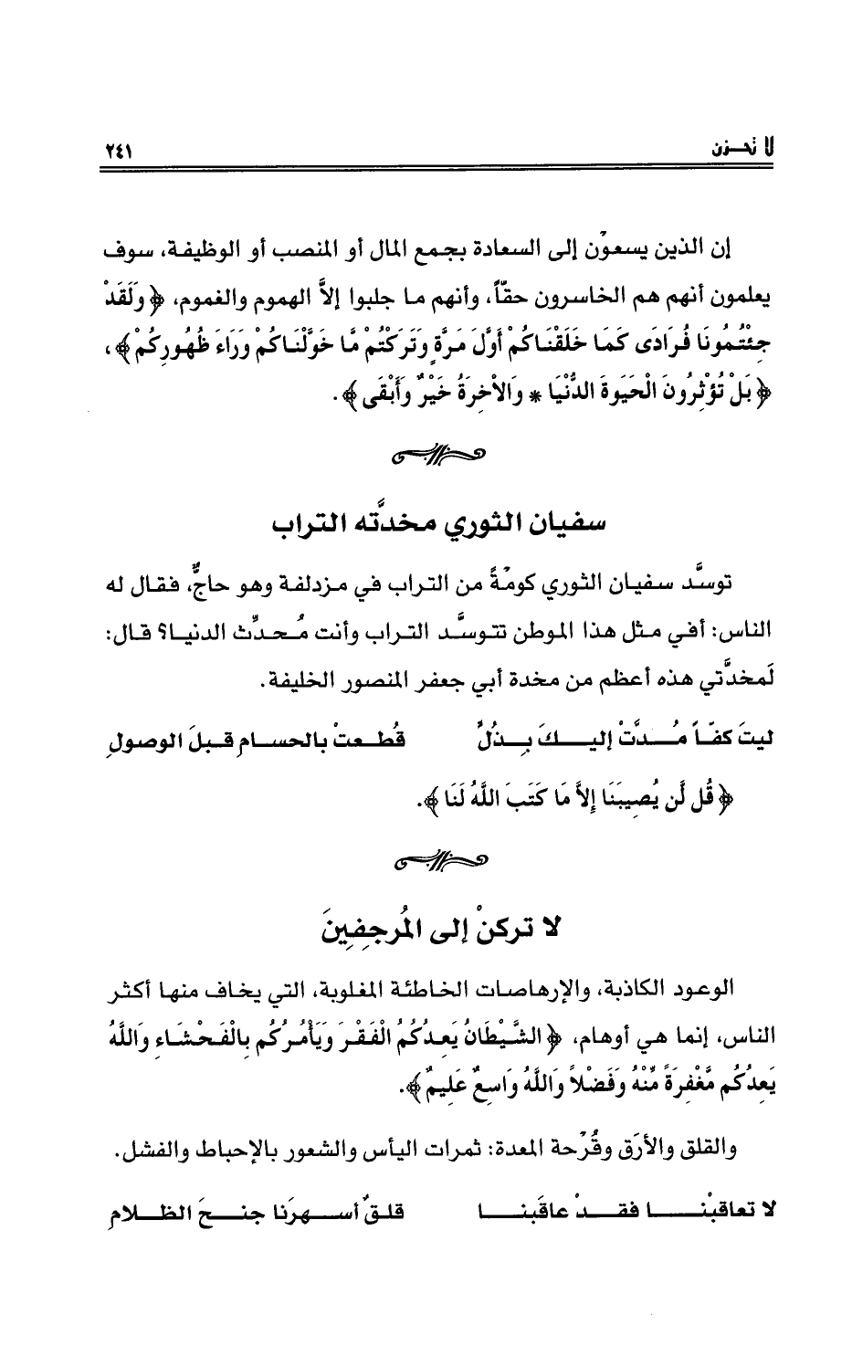 توسَّد سفيانُ الثوريُّ كومْةً منْ الترابِ في مزدلفة وهو حاجٌّ، فقال له الناسُ: أفي مثلِ هذا الموطنِ تتوسَّدُ الترابَ وأنت مُحدِّثُ الدنيا؟ قال: لمخدَّتي هذهِ أعظمُ منْ مخدةِ أبي جعفرٍ المنصورِ الخليفةِ.