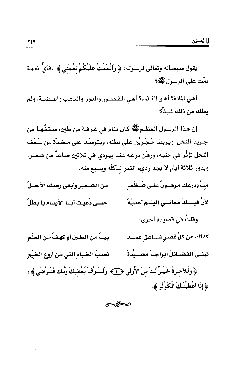 {وَلَلْآخِرَةُ خَيْرٌ لَّكَ مِنَ الْأُولَى {4} وَلَسَوْفَ يُعْطِيكَ رَبُّكَ فَتَرْضَى} ، {إِنَّا أَعْطَيْنَاكَ الْكَوْثَرَ} .