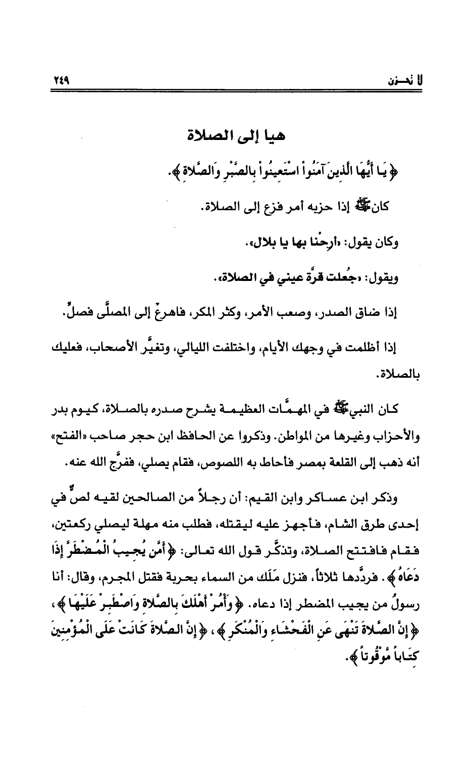كان النبيُّ - صلى الله عليه وسلم - في المهمَّاتِ العظيمةِ يشرحُ صدره بالصلاةِ، كيومِ يدْرٍ والأحزابِ وغيرِها من المواطنِ. وذكروا عنِ الحافظِ ابن حجرٍ صاحبِ (الفتحِ) أنه ذهب إلى القلعةِ بمصر فأحط به اللصوصُ، فقام يصلي، ففرَّج اللهُ عنهُ.