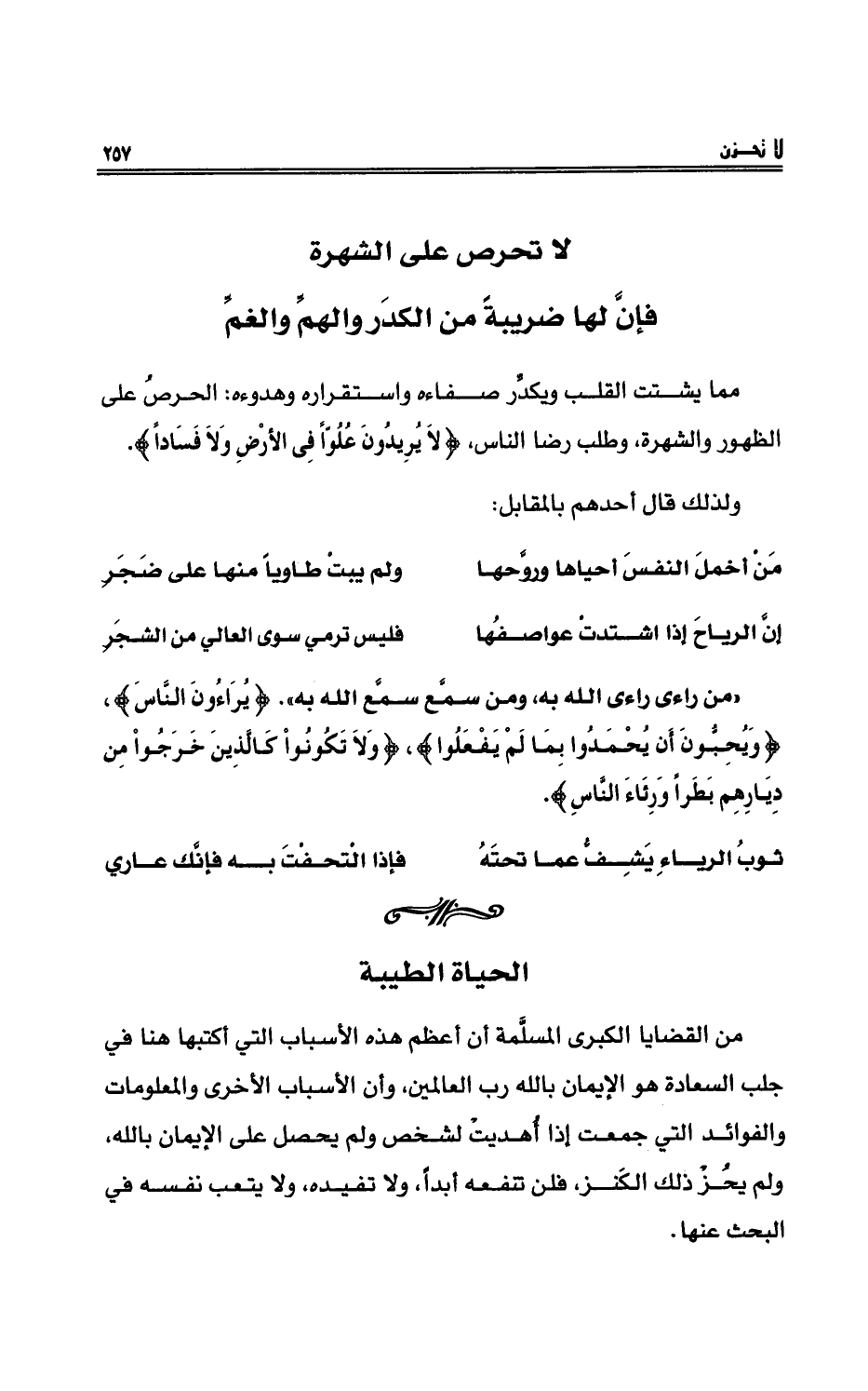 مما يشتتُ القلب ويكدِّرُ صفاءه واستقراره وهدوءه: الحرصُ على الظهورِ والشهرةِ، وطلبِ رضا الناسِ، {لَا يُرِيدُونَ عُلُوّاً فِي الْأَرْضِ وَلَا فَسَاداً} .