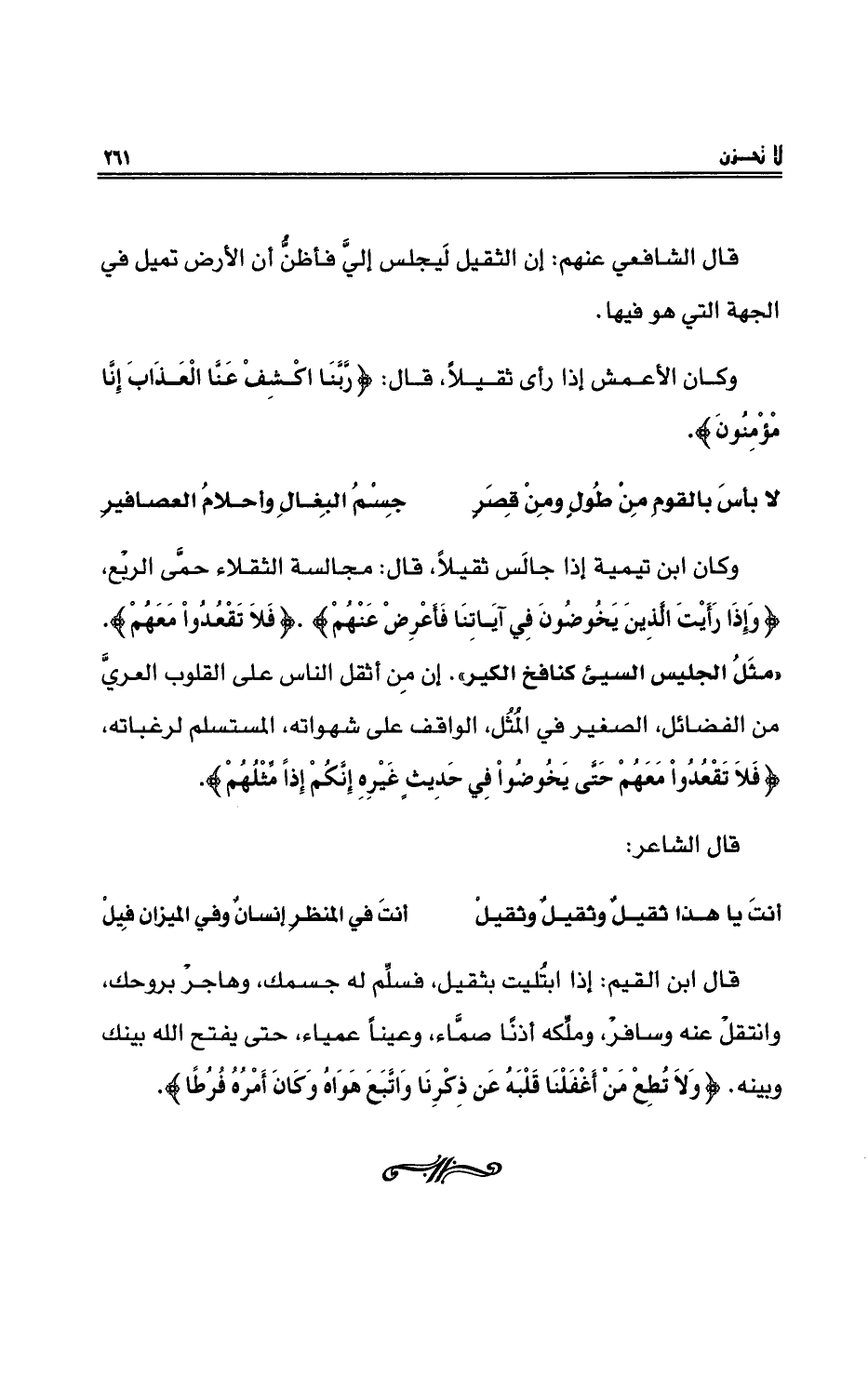 وكان ابنُ تيمية إذا جالس ثقيلاً، قال: مجالسةُ الثقلاءِ حمَّى الربْعِ، {وَإِذَا رَأَيْتَ الَّذِينَ يَخُوضُونَ فِي آيَاتِنَا فَأَعْرِضْ عَنْهُمْ} . {فَلاَ تَقْعُدُواْ مَعَهُمْ} . ((مثلُ الجليسِ السيّئِ كنافخ الكيرِ)) . إنَّ مِن اثقلِ الناسِ على القلوبِ العرِيَّ من الفضائلِ الصغير في المُثُلِ، الواقف على شهواتِه، المستسلم لرغباتِه، {فَلاَ تَقْعُدُواْ مَعَهُمْ حَتَّى يَخُوضُواْ فِي حَدِيثٍ غَيْرِهِ إِنَّكُمْ إِذاً مِّثْلُهُمْ} .