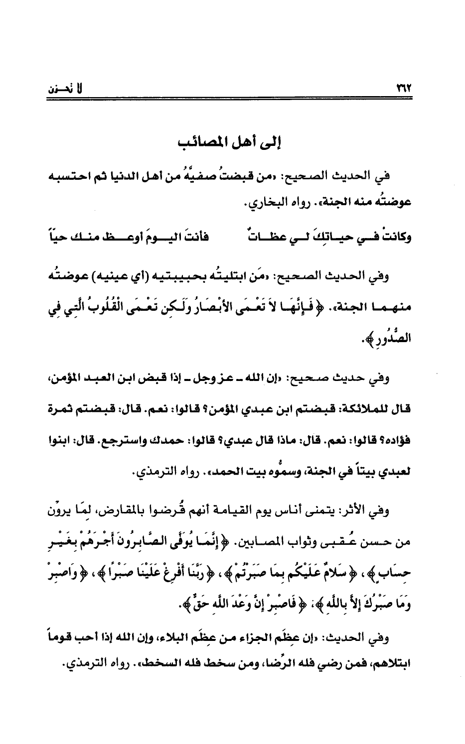 وفي الأثرِ: يتمنَّى أناسٌ يوم القيامةِ أنَّهمْ قُرِضوا بالمقارضِ، لمِا يروْن منْ حُسْنِ عُقبى وثوابِ المصابين. {إِنَّمَا يُوَفَّى الصَّابِرُونَ أَجْرَهُم بِغَيْرِ حِسَابٍ} ، {سَلاَمٌ عَلَيْكُم بِمَا صَبَرْتُمْ} ، {رَبَّنَا أَفْرِغْ عَلَيْنَا صَبْراً} ، {وَاصْبِرْ وَمَا صَبْرُكَ إِلاَّ بِاللهِ} ، {فَاصْبِرْ إِنَّ وَعْدَ اللَّهِ حَقٌّ} .