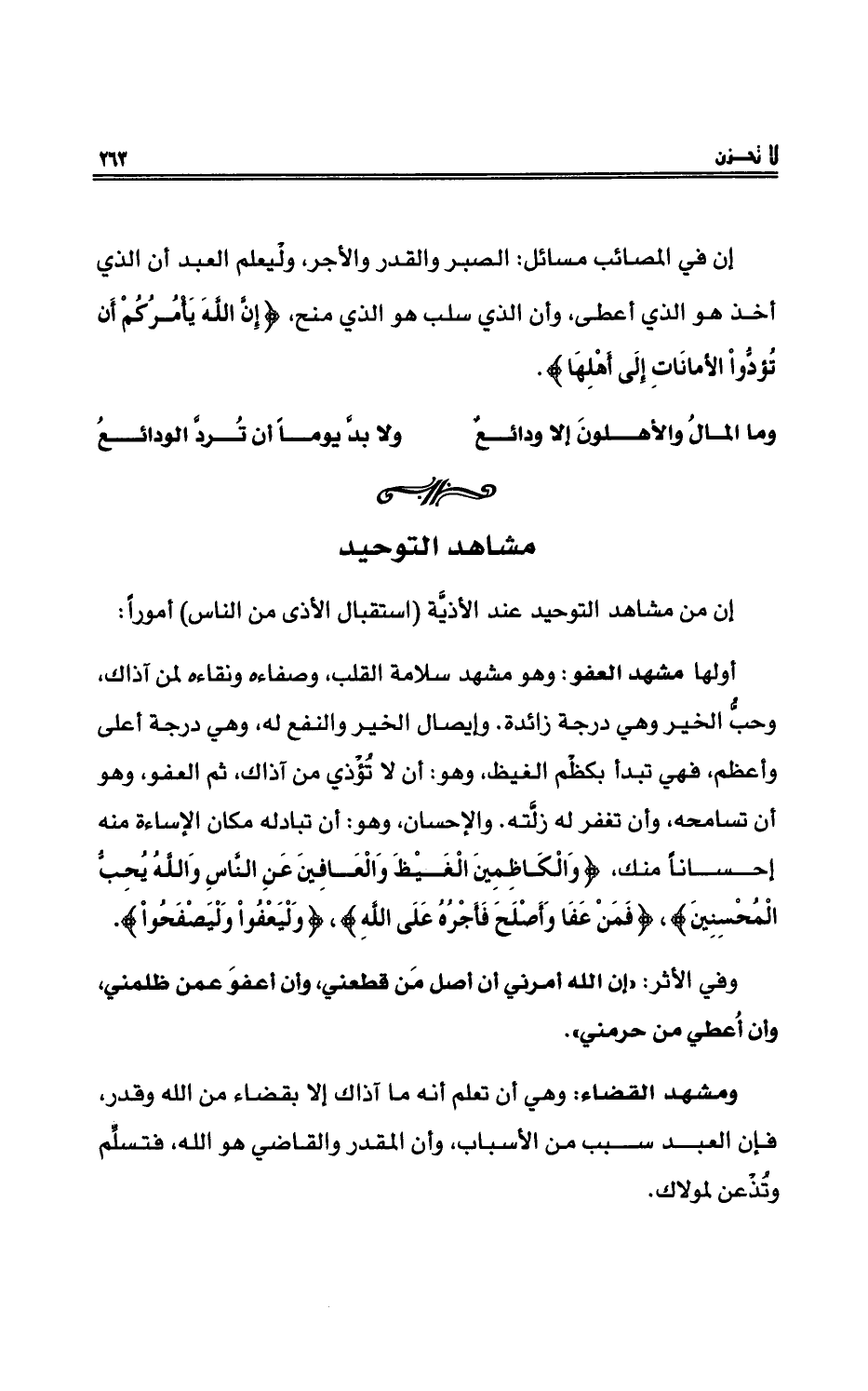 إنَّ في المصائبِ مسائلَ: الصبرَ والقدرَ والأجرَ، وليعلمِ العبدُ انَّ الذي أخذ هو الذي أعطى، وأنَّ الذي سلب هو الذي منح، {إِنَّ اللهَ يَأْمُرُكُمْ أَن تُؤدُّواْ الأَمَانَاتِ إِلَى أَهْلِهَا} .