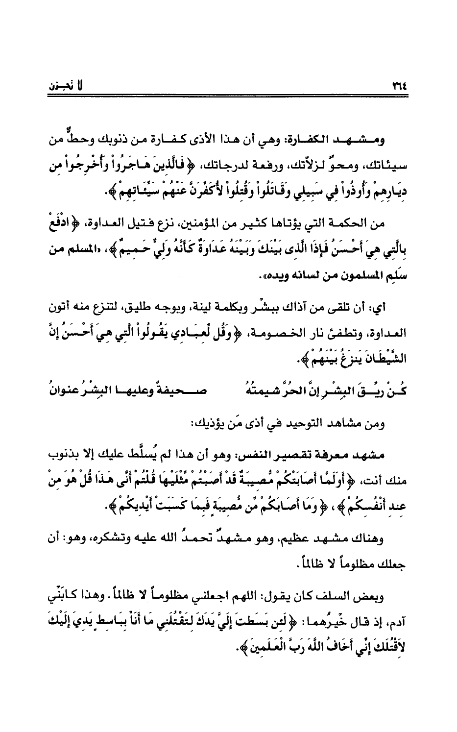 ومشهدُ الكفارةِ: وهي أنَّ هذا الأذى كفارةٌ منْ ذنوبك وحطٌّ منْ سيئاتِك، ومحوٌ لزلاّتِك، ورفعةٌ لدرجاتِك، {فَالَّذِينَ هَاجَرُواْ وَأُخْرِجُواْ مِن دِيَارِهِمْ وَأُوذُواْ فِي سَبِيلِي وَقَاتَلُواْ وَقُتِلُواْ لأُكَفِّرَنَّ عَنْهُمْ سَيِّئَاتِهِمْ} .