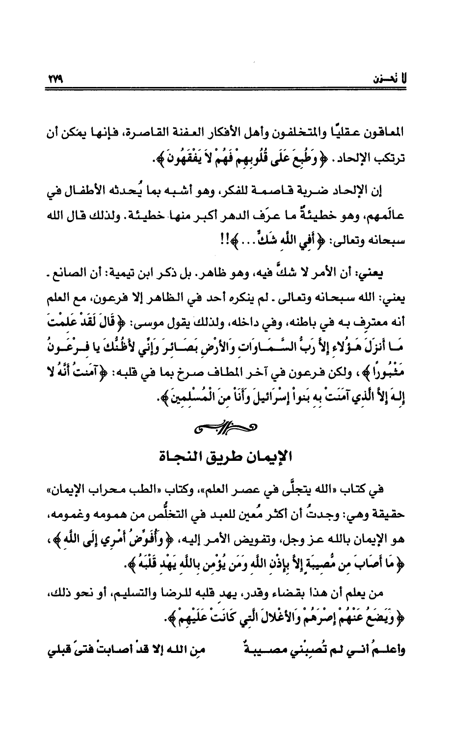 في كتابِ (اللهُ يتجلَّى في عصرِ العلمِ) ، وكتاب (الطبُّ مِحْرابُ الإيمانِ) حقيقةٌ وهي: وجدتُ أنَّ أكثر مُعين للعبدِ في التخلُّص منْ همومِه وغمومِه، هو الإيمانُ باللهِ عزَّ وجلّ، وتفويضُ الأمرِ إليه، {وَأُفَوِّضُ أَمْرِي إِلَى اللَّهِ} ، {مَا أَصَابَ مِن مُّصِيبَةٍ إِلَّا بِإِذْنِ اللَّهِ وَمَن يُؤْمِن بِاللَّهِ يَهْدِ قَلْبَهُ} .