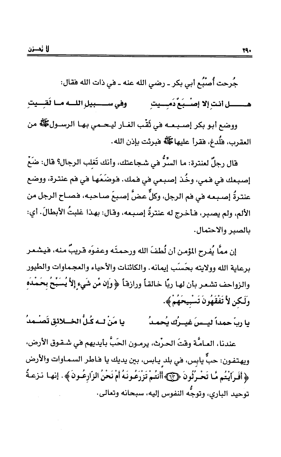 جُرحتْ أُصْبُعُ أبي بكرٍ - رضي اللهُ عنهُ - في ذاتِ اللهِ فقال: