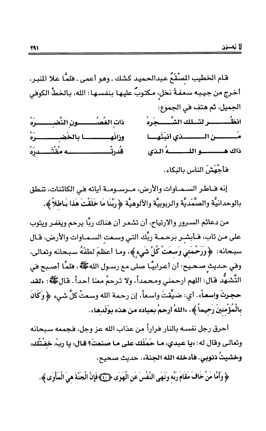 منْ دعائمِ السرورِ والارتياحِ، أنْ تشْعُرَ أنَّ هناك ربّاً يرحمُ ويغفرُ ويتوبُ على منْ تاب، فأبشِرْ برحمةِ ربِّك التي وسعتِ السماواتِ والأرض، قال سبحانه: {وَرَحْمَتِي وَسِعَتْ كُلَّ شَيْءٍ} ، وما أعظم لطفهُ سبحانه وتعالى، وفي حديثٍ صحيحٍ: أنَّ أعرابيّاً صلًّى مع رسولِ اللهِ - صلى الله عليه وسلم -، فلمَّا أصبح في التَّشهُّدِ قال: اللهمَّ ارحمني ومحمداً، ولا ترحمْ معنا أحداً. قال - صلى الله عليه وسلم -: ((لقدْ حجرت واسعاً)) . أي: ضيَّقت واسعاً، إنَّ رحمة الهِ وسعتْ كلَّ شيءٍ {وَكَانَ بِالْمُؤْمِنِينَ رَحِيماً} ، ((اللهُ أرحمُ بعبادِهِ منْ هذهِ بولدِها)) .