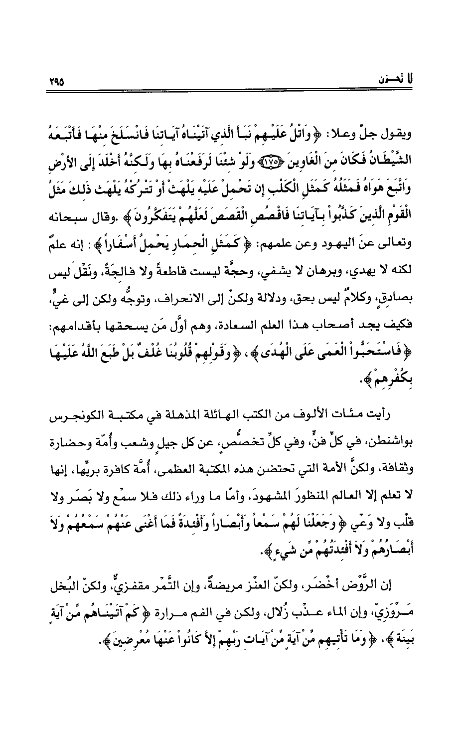 رأيتُ مئاتِ الألوفِ من الكتبِ الهائلةِ المذهلةِ في مكتبةِ الكونجرس بواشنطن، في كلِّ فنٍّ، وفي كلِّ تخصُّصٍ، عنْ كلِّ جيلٍ وشعبٍ وأُمةٍ وحضارةٍ وثقافةٍ، ولكنَّ الأمة التي تحتضنُ هذه المكتبة العظمى، أُمَّةٌ كافرةٌ بربِّها، إنها لا تعلمُ إلا العالم المنظور المشهود، وأمّا ما وراء ذلك فلا سمْع ولا بَصَرَ ولا قلْبَ ولا وَعْيَ {وَجَعَلْنَا لَهُمْ سَمْعاً وَأَبْصَاراً وَأَفْئِدَةً فَمَا أَغْنَى عَنْهُمْ سَمْعُهُمْ وَلَا أَبْصَارُهُمْ وَلَا أَفْئِدَتُهُم مِّن شَيْءٍ} .