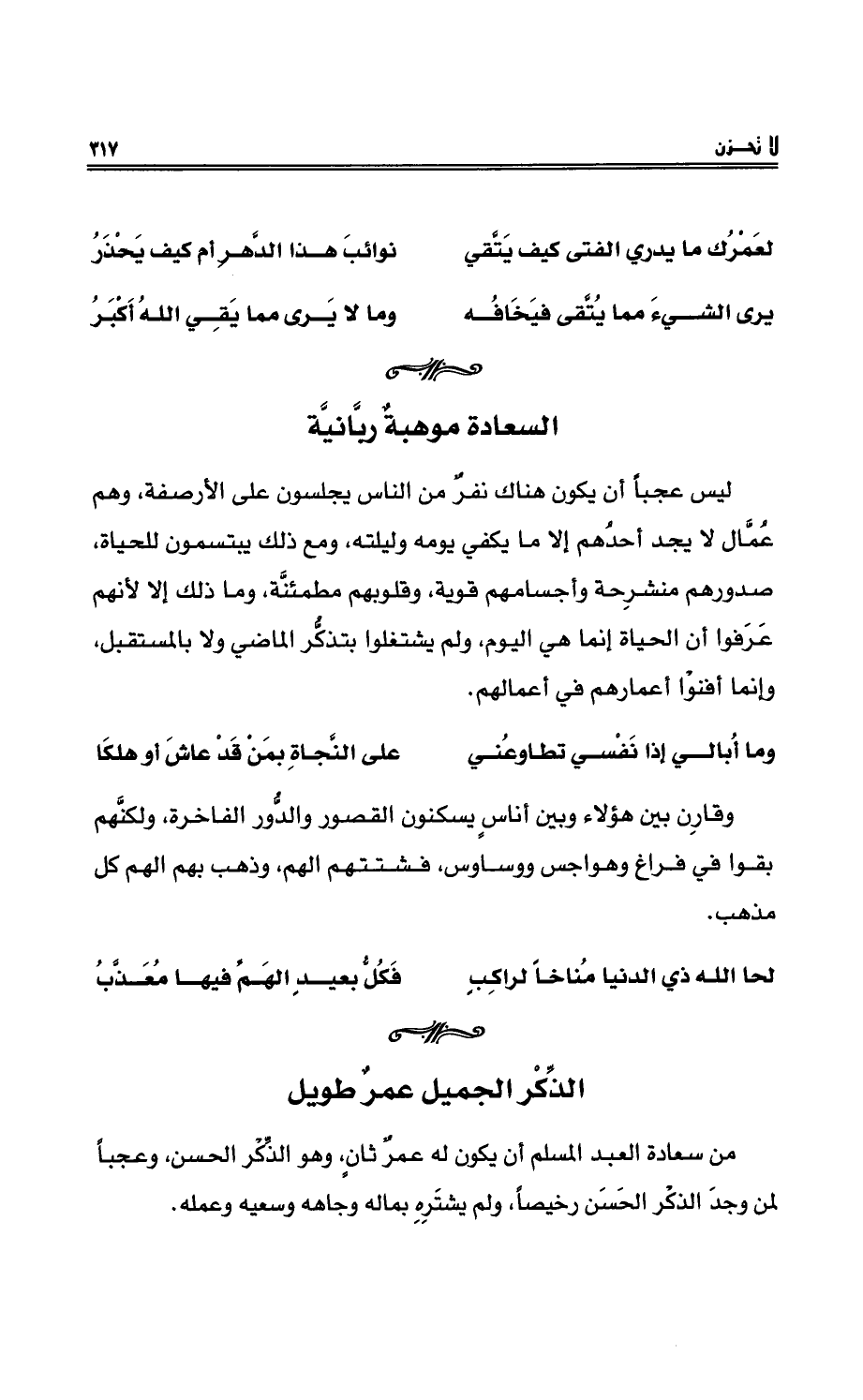 ليس عجباً أنْ يكون هناك نفرٌ من الناسِ يجلسون على الأرصفةِ، وهم عُمَّالٌ لا يجدُ احدُهم إلا ما يكفي يومه وليلته، ومع ذلك يبتسمون للحياةِ، صدورُهم منشرِحةٌ وأجسامُهم قويةٌ، وقلوبُهم مطمئنَّةٌ، وما ذلك إلا لأنَّهم عَرَفوا أنَّ الحياة إنما هي اليومُ، ولم يشتغلوا بتذكُّرِ الماضي ولا بالمستقبلِ وإنما أفنوْا أعمارهم في أعمالِهم.